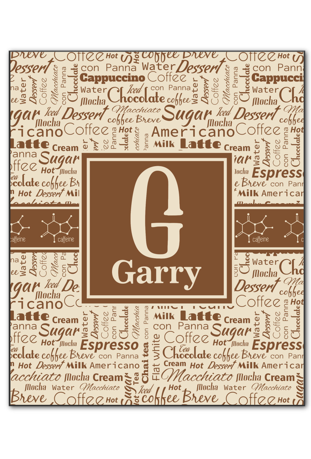This design has a fun word cloud background with words like macchiato, sugar, coffee, latte, americano, and more. The colors are a light cream and chocolate brown. In the center is a frame where you are able to add personalization. The ribbon behind the frame has the chemical symbol for caffiene.