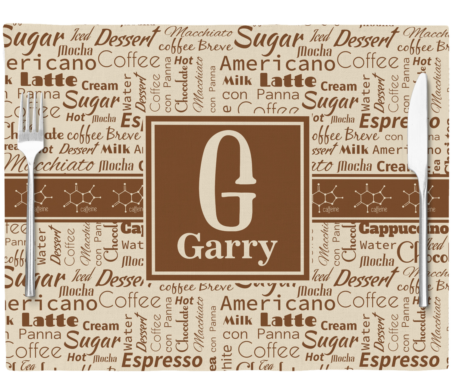 This design has a fun word cloud background with words like macchiato, sugar, coffee, latte, americano, and more. The colors are a light cream and chocolate brown. In the center is a frame where you are able to add personalization. The ribbon behind the frame has the chemical symbol for caffiene.