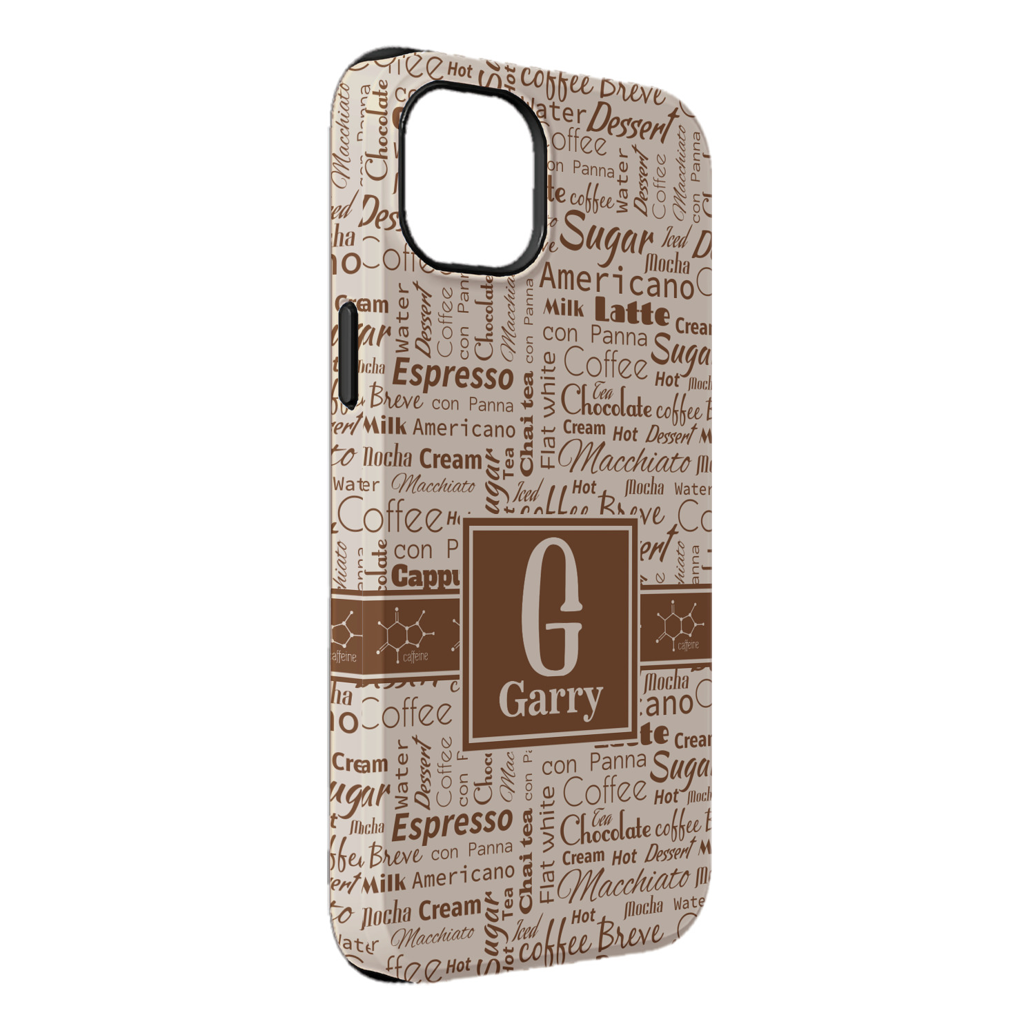 This design has a fun word cloud background with words like macchiato, sugar, coffee, latte, americano, and more. The colors are a light cream and chocolate brown. In the center is a frame where you are able to add personalization. The ribbon behind the frame has the chemical symbol for caffiene.