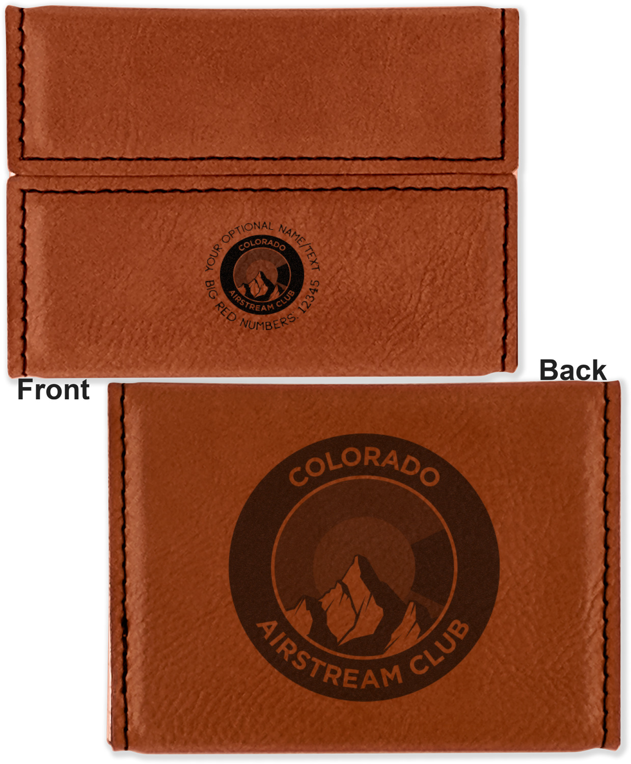 Your personalized design is laser engraved onto either the front, or the front and back of the card holder, depending on the model you purchase. Once engraved, the design will appear a darkened black against the cognac color of the leatherette.