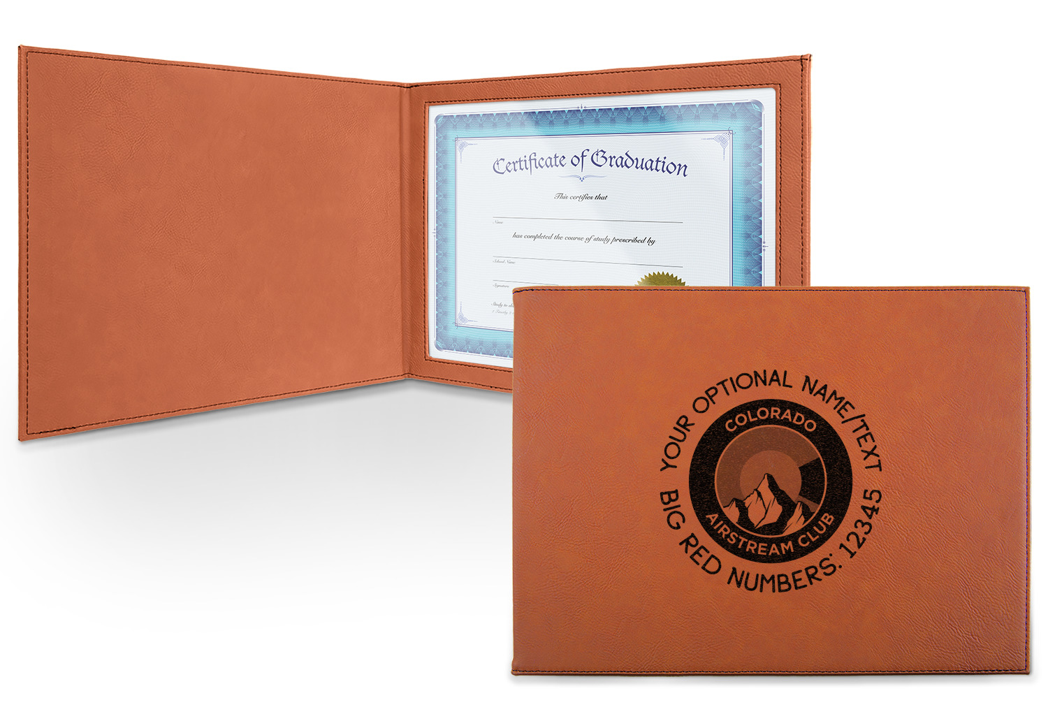 This cognac-colored, leatherette certificate jacket is the ideal way to display or store your hard-earned certificate. When closed, the custom certificate holder measures at 12 by 9 inches. The interior of the certificate cover includes a clear, vinyl window to encase your diploma. The window measures at around 10.5 by 7.5 inches and can accommodate a diploma that measures at up to 8.5 by 11 inches. You can either choose to have your customization laser engraved on the front and interior, or solely the front.