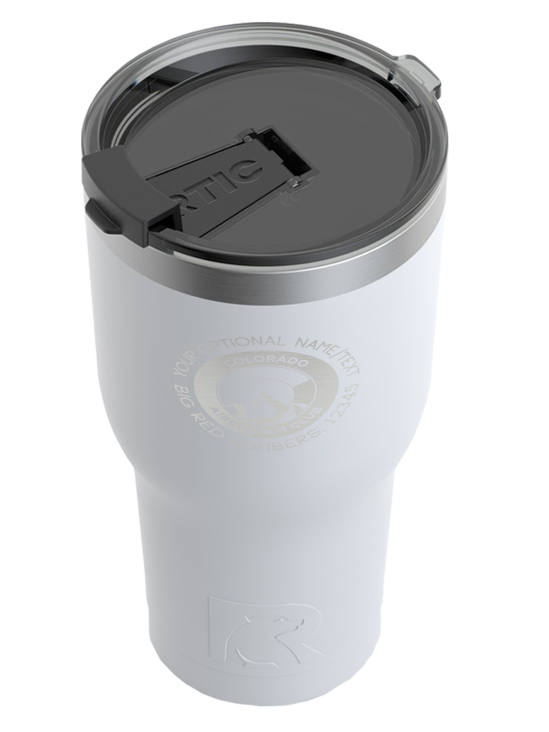 These RTIC cups are crafted from an 18/8 stainless steel, making them durable and heavy-duty. They are also double-walled and vacuum-sealed, making them the perfect insulated coffee tumbler! At 4 by 4.5 by 8 inches, these tumblers can hold up to 30 ounces of liquid, and they will keep your beverage hot or cold for hours! Also, the tapered shape and slender bottom makes these custom tumbler cups easy to grip, and can fit in most car cup holders! The tumbler is accompanied by a clear lid with a tab that can be easily flipped back when you need to drink. The RTIC logo appears on the neck and lid of the customizable tumblers.