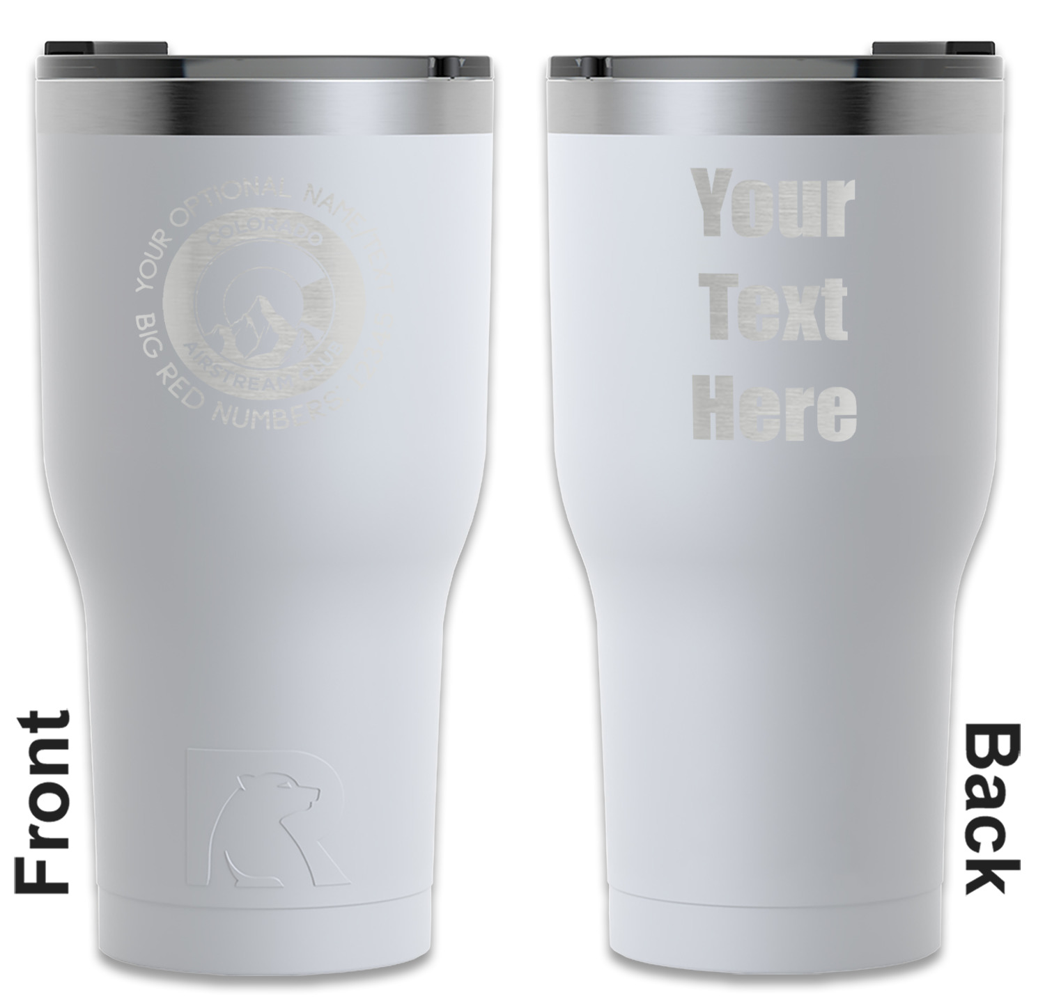 We sell these RTIC 30 Oz Tumblers in three different colors with two different engraving options. Choose from our selection of teal, white, or black. You can either choose to engrave the front only or both front and back. Your engravement will reveal the stainless steel material beneath the powder color coating, creating your personalization in a beautiful silver.