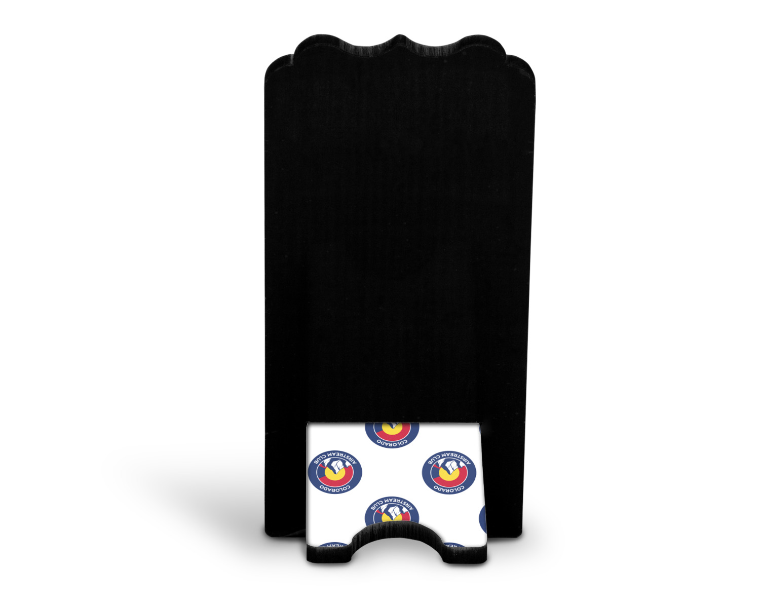 These cell phone holders are comprised of two hardboard pieces, that lock into and steady one another. The bottom part of the mobile phone stand is spacious enough to support both your phone and your charger, while it is not in use. We print your customization atop the face of this stand, while the remaining sides are a sophisticated, black color.