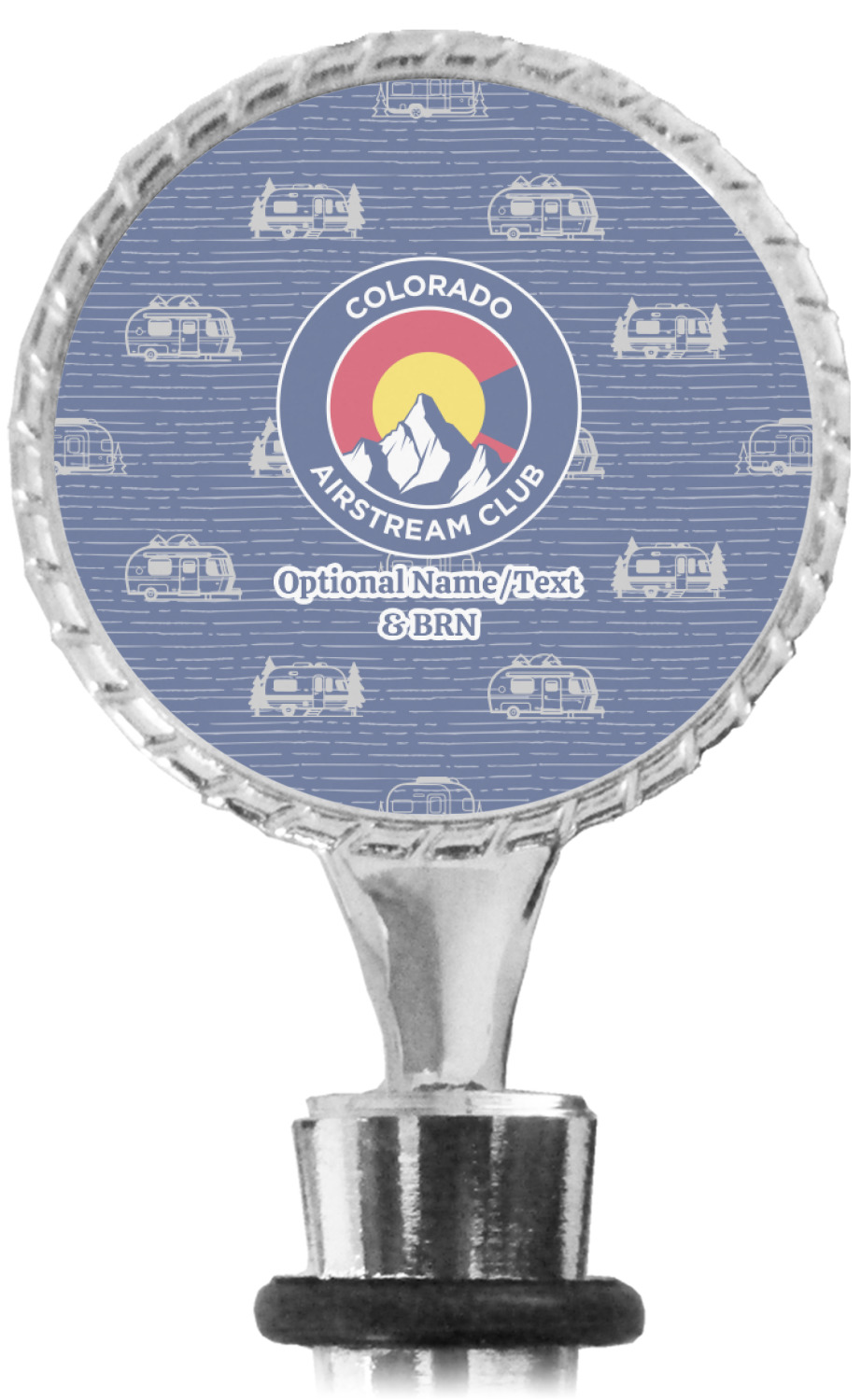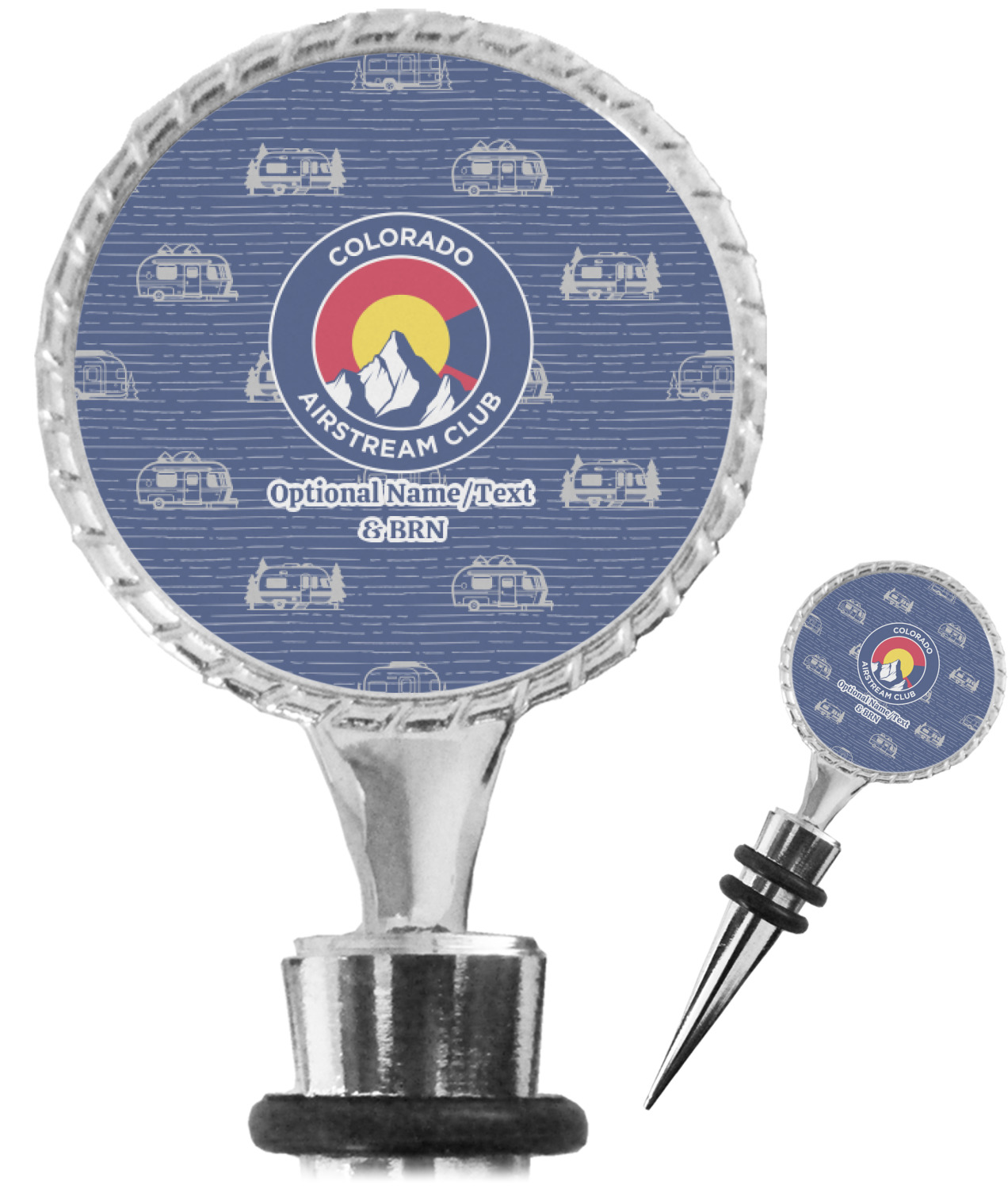 The top part of your bottle stopper is comprised of a zinc ring that displays your customization(s) in its middle, on both sides. The ring is heavy duty, with a bright chrome finish. The body of the wine stoppers have two silicone rings to provide an airtight seal. These wine bottle stoppers measure at 1.625" L x 0.8125" W x 4.625" H; your custom wine stopper is meant to fit into most standard-sized wine bottles.