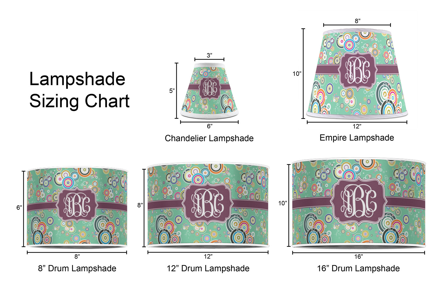 Our customized lamp shades also come in 3 different sizes: 8", 12" and 16", measuring at 8" in diameter by 6" tall, 12" in diameter by 8" tall, and 16" in diameter by 10" tall, respectively.
