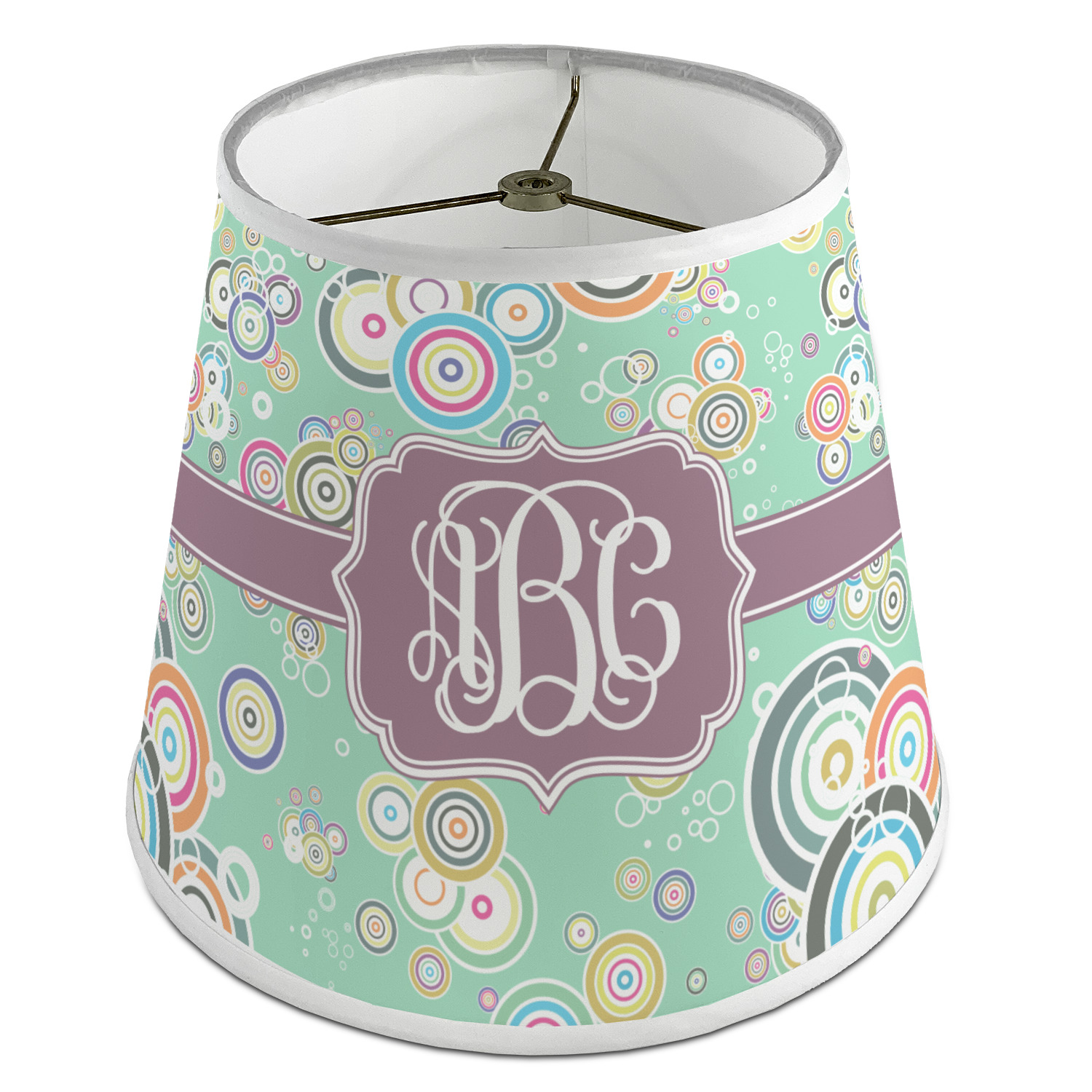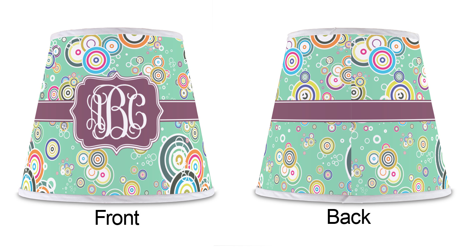 The base of this lampshade is 12 inches in diameter, and the top spans 8 inches in diameter. The total height of the lampshade is 10 inches. The angled nature of this custom lampshade concentrates the light, making it ideal for smaller spaces. This lampshade is made of matte, polyfilm, and displays your customization in its middle. The top and bottom of this colorful lamp shade are lined with a white fabric ribbon (which can be replaced with black inside the design studio) which frames your design and creates a sophisticated finish. As an UNO fitter lampshade, this unique lamp shade will fit a variety of bases.