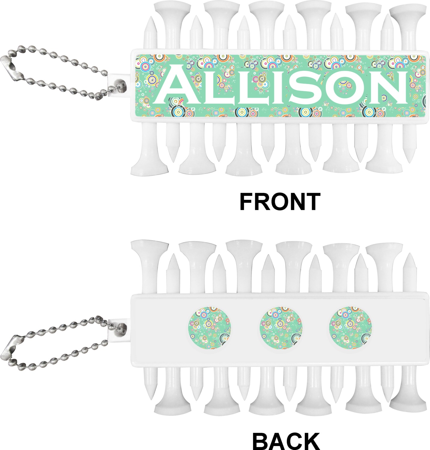 With 12 tees on a lightweight, portable key chain, it almost ensures a great 18 holes. Our tees are made of white plastic and are a little over 2". Design the front and the back of the golf tee holder. Pick from over a hundred designs, colors, and personalization styles! The set even comes with three removable ball markers as well!