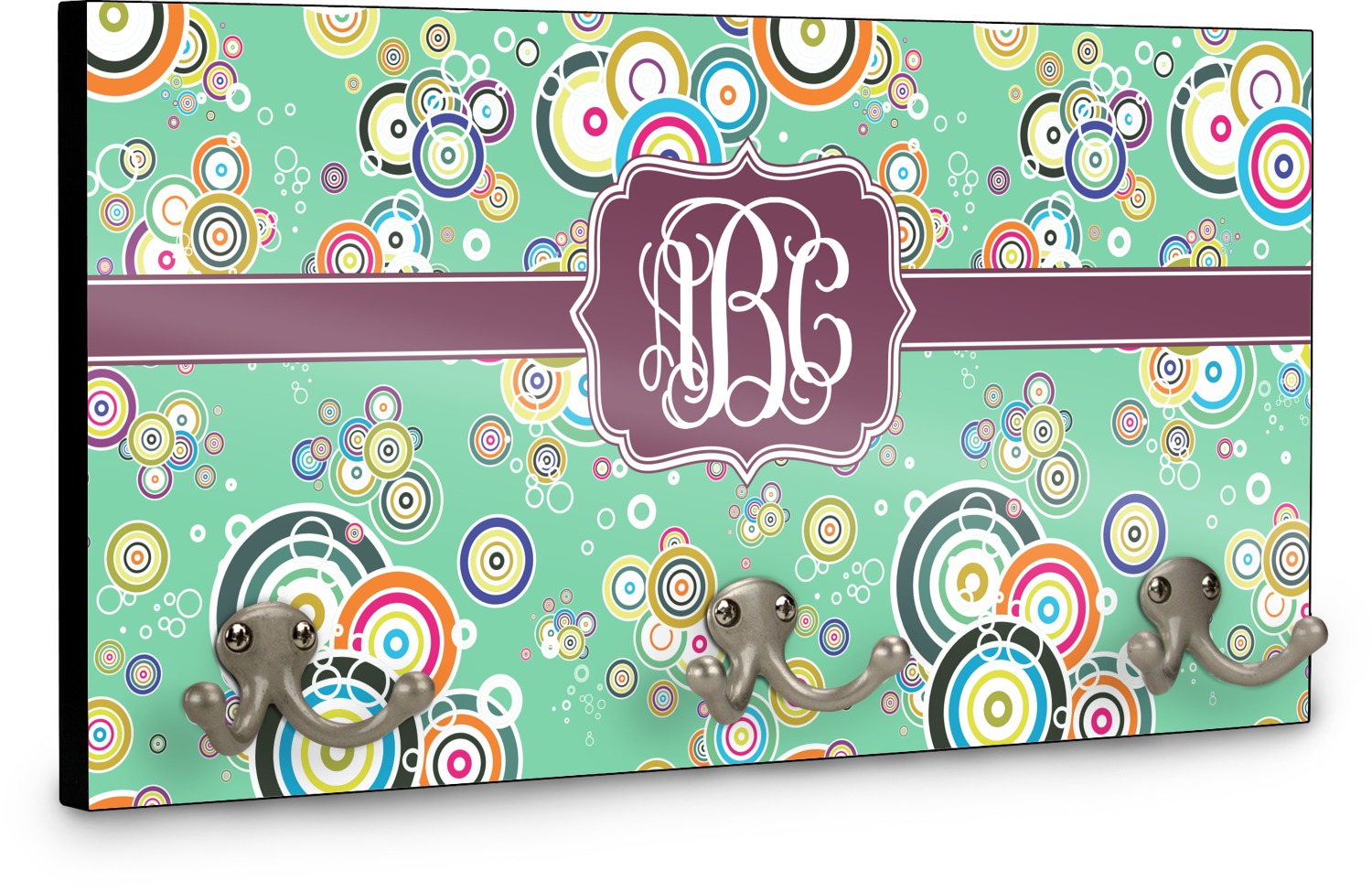 This coat rack is the perfect way to add some personality to your wall or entryway. The board is made of a strong maple that is approximately 16" x 8". The three 2-prong hooks are a sturdy metal that have three screws attaching them to the board. Your design is printed right onto the front of the board while the back and sides are a simple black.