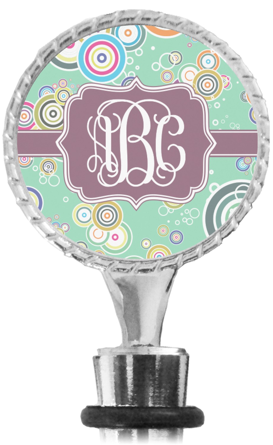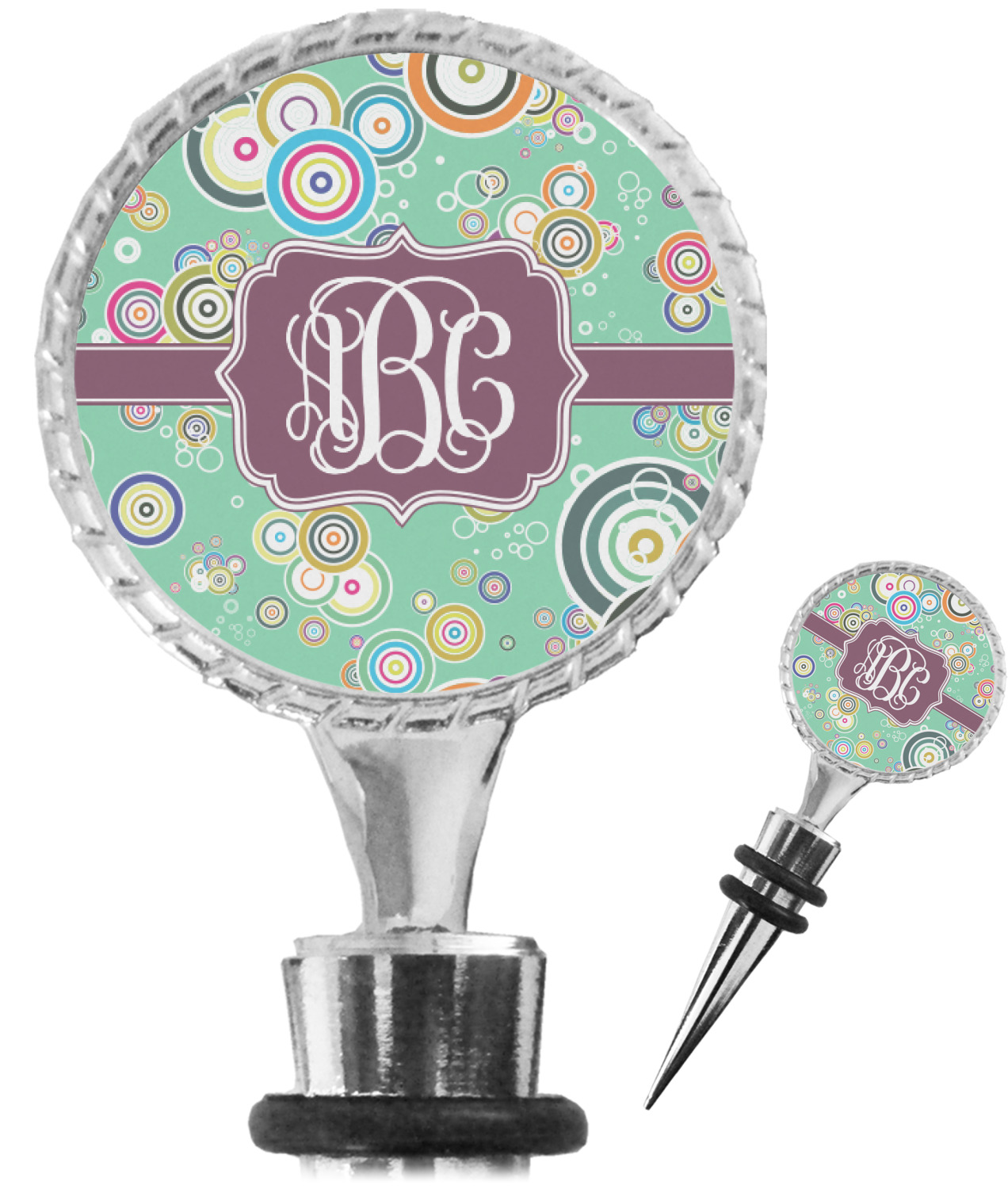 The top part of your bottle stopper is comprised of a zinc ring that displays your customization(s) in its middle, on both sides. The ring is heavy duty, with a bright chrome finish. The body of the wine stoppers have two silicone rings to provide an airtight seal. These wine bottle stoppers measure at 1.625" L x 0.8125" W x 4.625" H; your custom wine stopper is meant to fit into most standard-sized wine bottles.