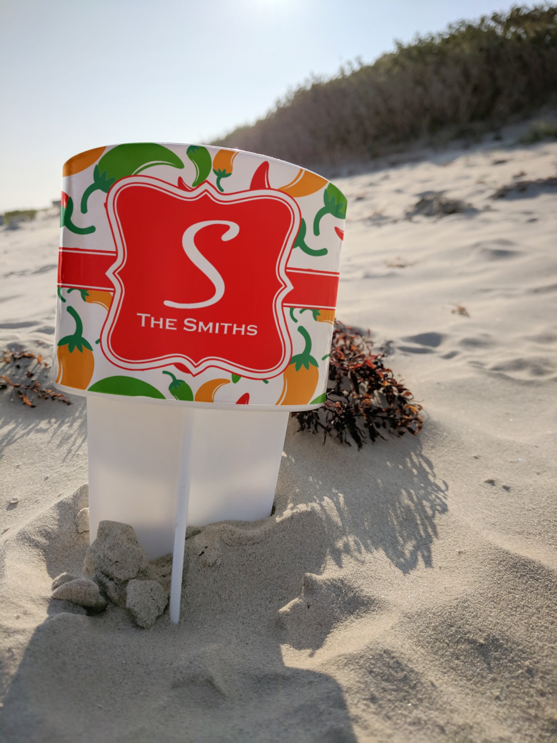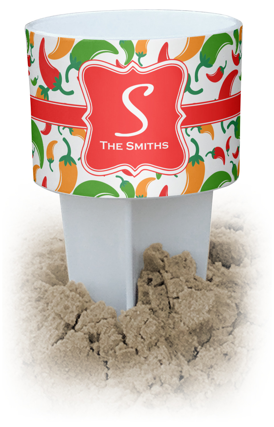 This cup holder has a large stake at its bottom that anchors it to the sand or ground below, while the cup holder rests above the stake. The entire drink holder is made of durable plastic and displays your customization around the cup holder portion. We sell these personalized beach spikers in two different colors: black and white.