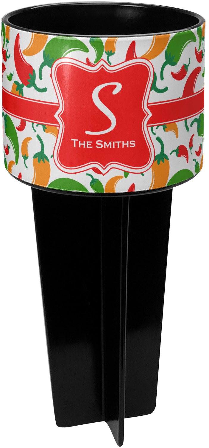 This cup holder has a large stake at its bottom that anchors it to the sand or ground below, while the cup holder rests above the stake. The entire drink holder is made of durable plastic and displays your customization around the cup holder portion. We sell these personalized beach spikers in two different colors: black and white.