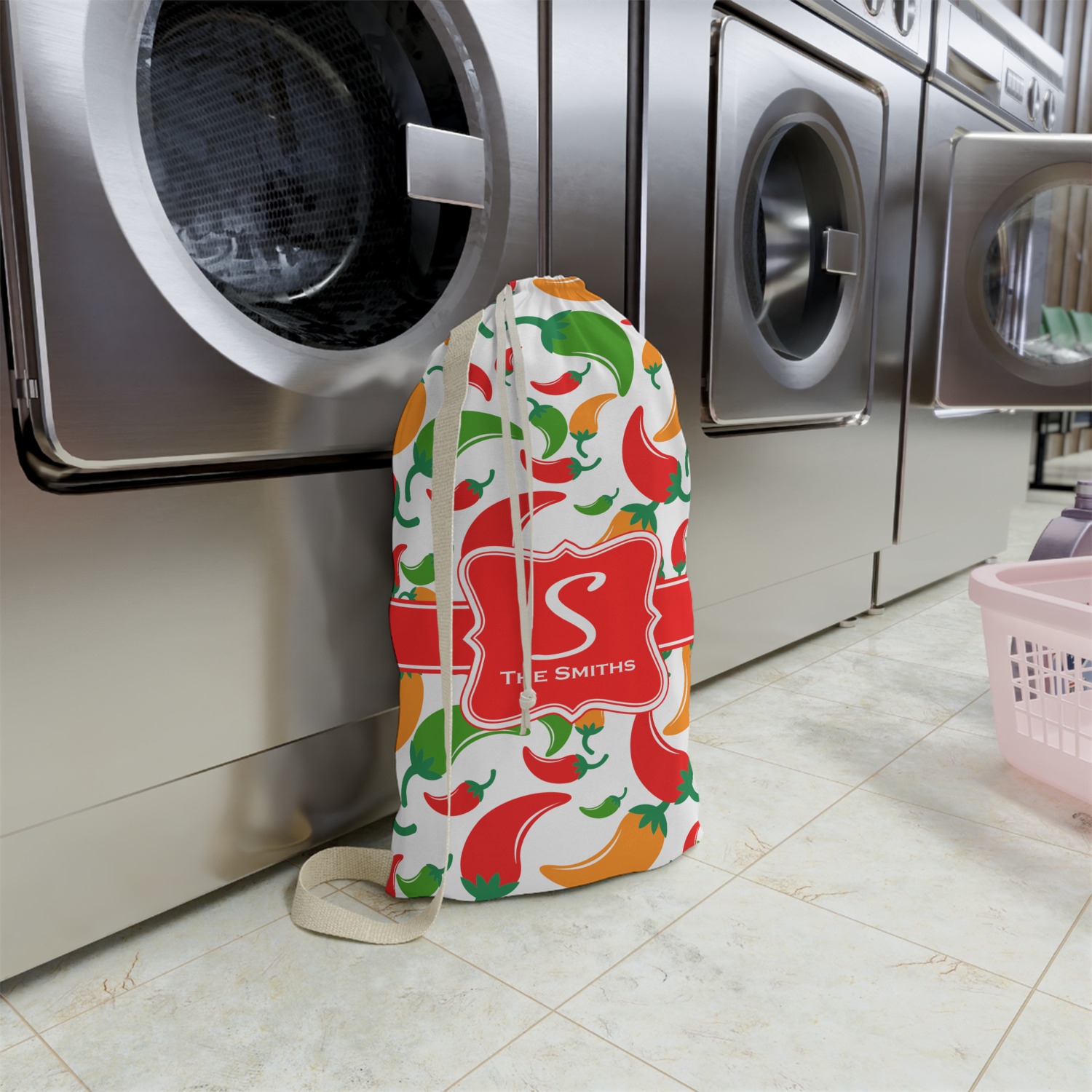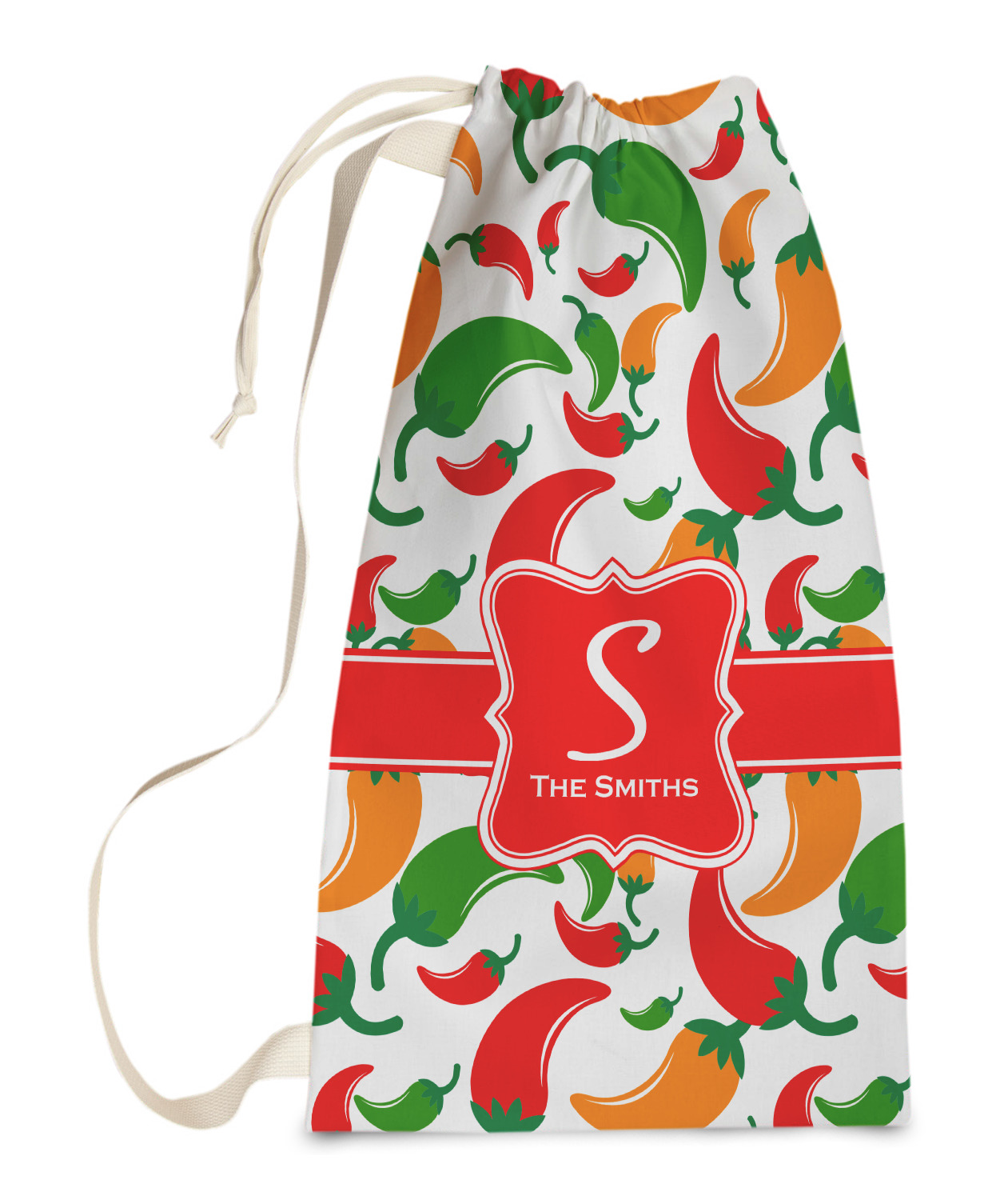 Carry your laundry in style with these customized laundry bags. Available in two sizes, featuring a natural colored woven strap and a cinch cord, these bags hold a lot of clothes or anything else you want to fit in them.