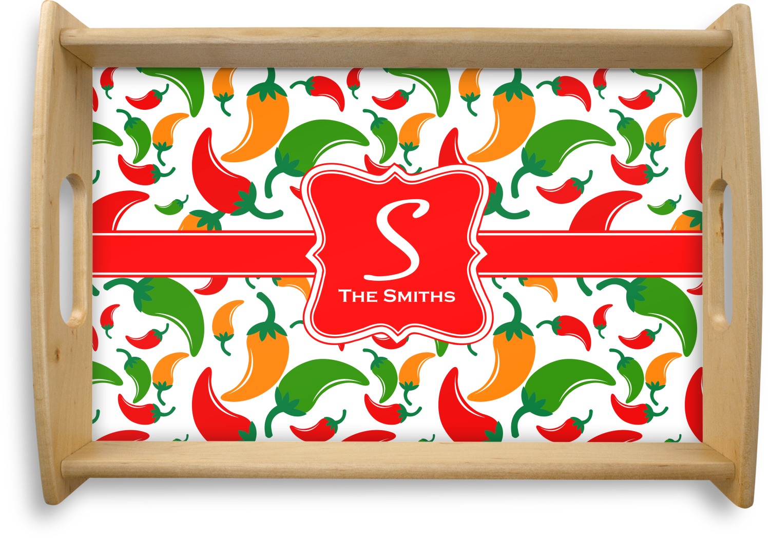 This serving tray with handles features square edges and two rounded sides, creating a very modern look. Each side is fabricated from a beautifully cut, natural wood. The bottom of the interior of the tray displays your customized design in bright, vibrant color. The tray is sold in both a black color and a natural wood look. Each variation of the wood serving tray has two sizes: Small, which is 14" x 10" x 2.25", and Large, which is 19.5" x 13.5" x 2.75".