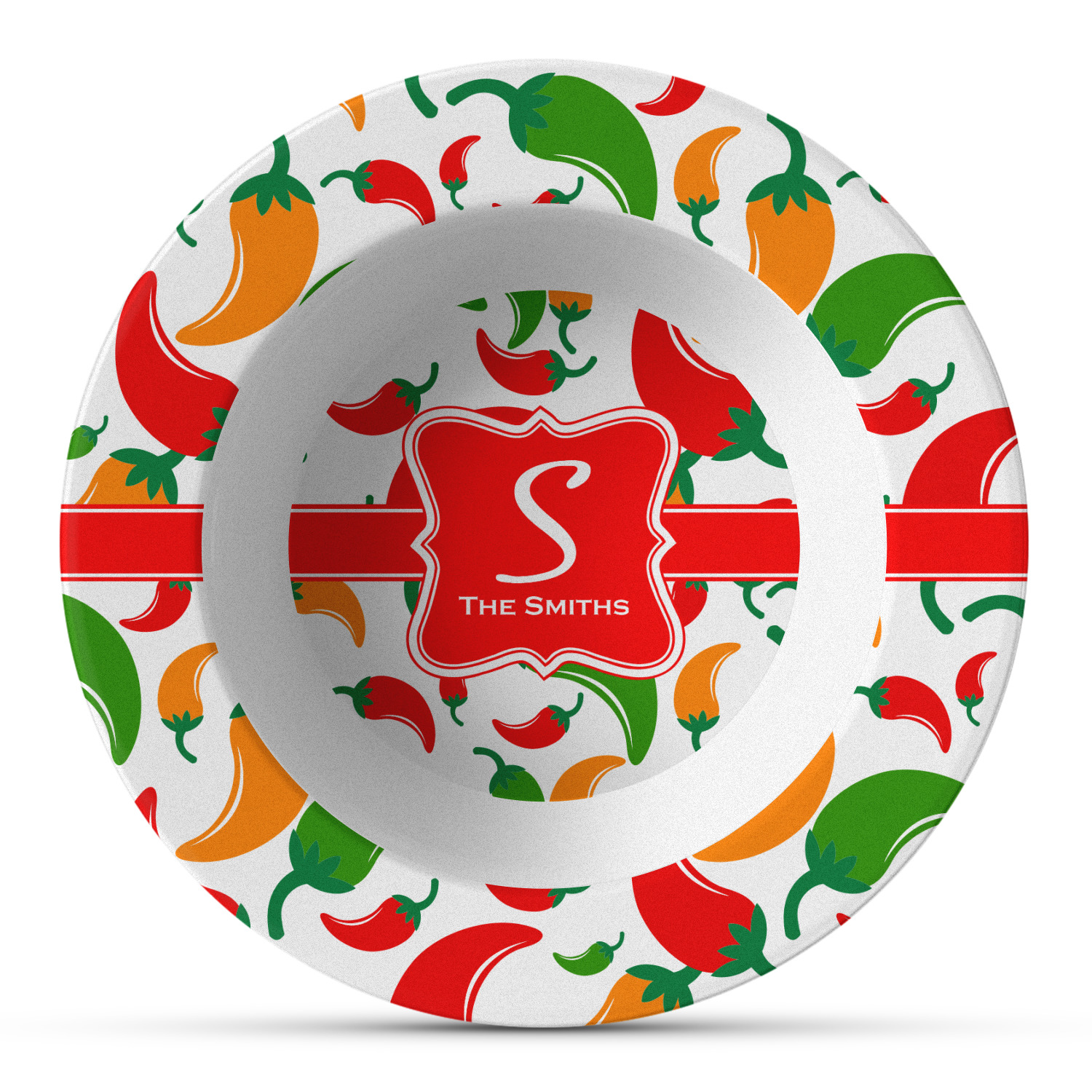 Made from a composite, thermo-set, polymer plastic, these dinner bowls have the versatility, durability, and weight of a melamine bowl without any of the downsides of melamine. Unlike melamine dinnerware, these bowls can withstand high heat. These custom plastic bowls can even handle temperatures of up to 250 degrees Fahrenheit, for up to 60 minutes. The pieces of our plastic dinner set are never made with harmful chemicals, such as BPAs, formaldehyde, DEHPs. We display your personalization on the base of this bowl's interior, while the bowl itself has an 8.75" diameter and is 1.75" tall.