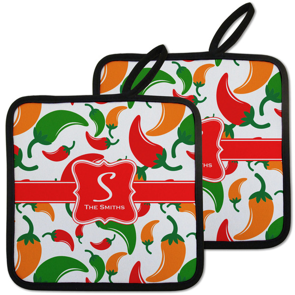 Our personalized pot holders feature a neoprene front that displays your personalization in vibrant colors. The backing of the hot pot holder is rubberized; the textured backing allows you to have a great grip when using this custom pot holder. The two materials are joined with a sleek, black trim, and the holder also includes an attached loop for hanging and storage. The pot holder is approximately 8.75 inches by 8.75 inches and 0.25 inches tall, while the fabric loop is 2.5 inches long. You can purchase a kitchen pot holder by itself or as a set of 2. We also offer a set including one pot holder and one oven mitt.