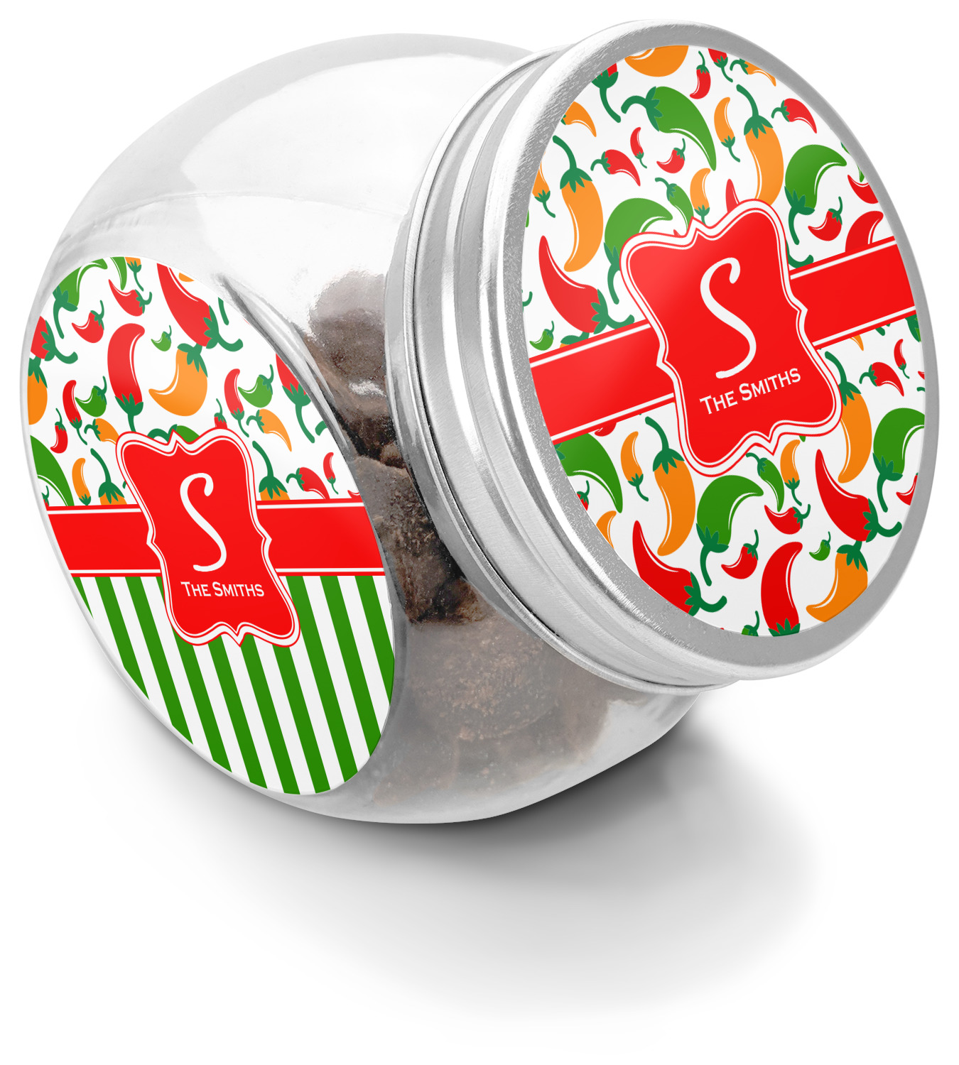 This treat jar is an excellent way to store treats for your favorite canine or feline. Moreover, their delicate, classy appearance makes them a tasteful addition to your countertop's décor. Crafted from clear glass, its unique construction and silver metal, screw-on lid allows for quick and easy access. Three, permanent, vinyl stickers are applied to both sides of the jar and lid, presenting your personalized design. The base of this glass, dog treat jar is 3.4" x 4.75", and the jar stands at 5" tall. Though on the smaller side, this jar is best suited for smaller treats or training treats.