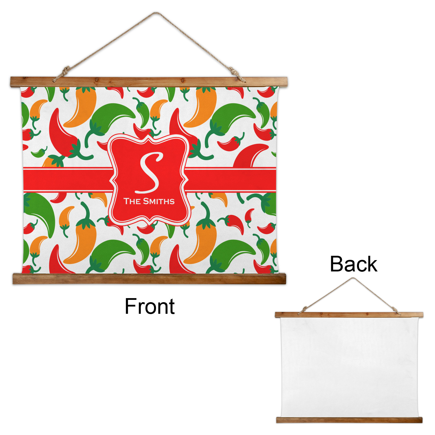 Made in two different orientations - portrait or landscape - both are 26" x 36". Your design is printed on a high quality polyester fabric with hemmed edges. The wood on the top and bottom of the tapestry is 1.25" tall and 0.25" thick and there are two pieces on top and bottom which sandwich the fabric.