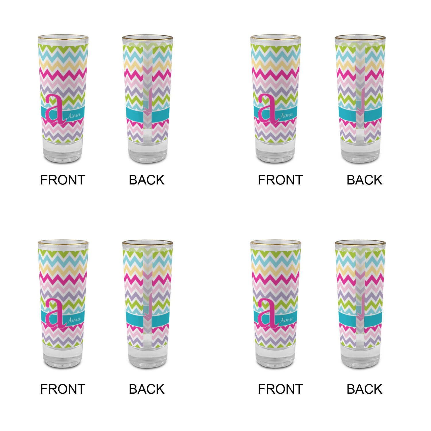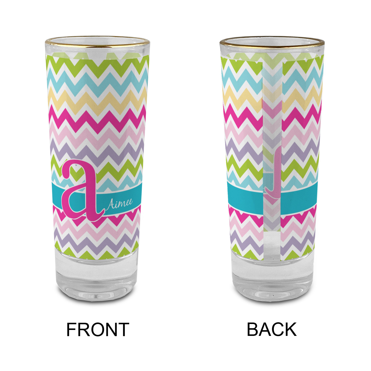 These glass shooter glasses are printed in full color with the design of your choice. These are a tall shooter 2 oz size and stand 4" tall. The print is a full wrap design to boldly display your personalization.