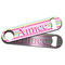 Made from stainless steel, these beer bottle openers are 7 by 1.625 inches, giving you plenty of leverage when trying to open a stubborn bottle. On one end of this personalized bottle opener, you'll find a circular hole for you to hang and display your opener. On the opposite end, you'll find the tool used for opening bottles. This opener in particular has the same structure and style as professional bartender bottle openers. Your customization is sublimated onto both the back and front, and both sides can be customized individually. Choose from one of our two base colors - white or silver.
