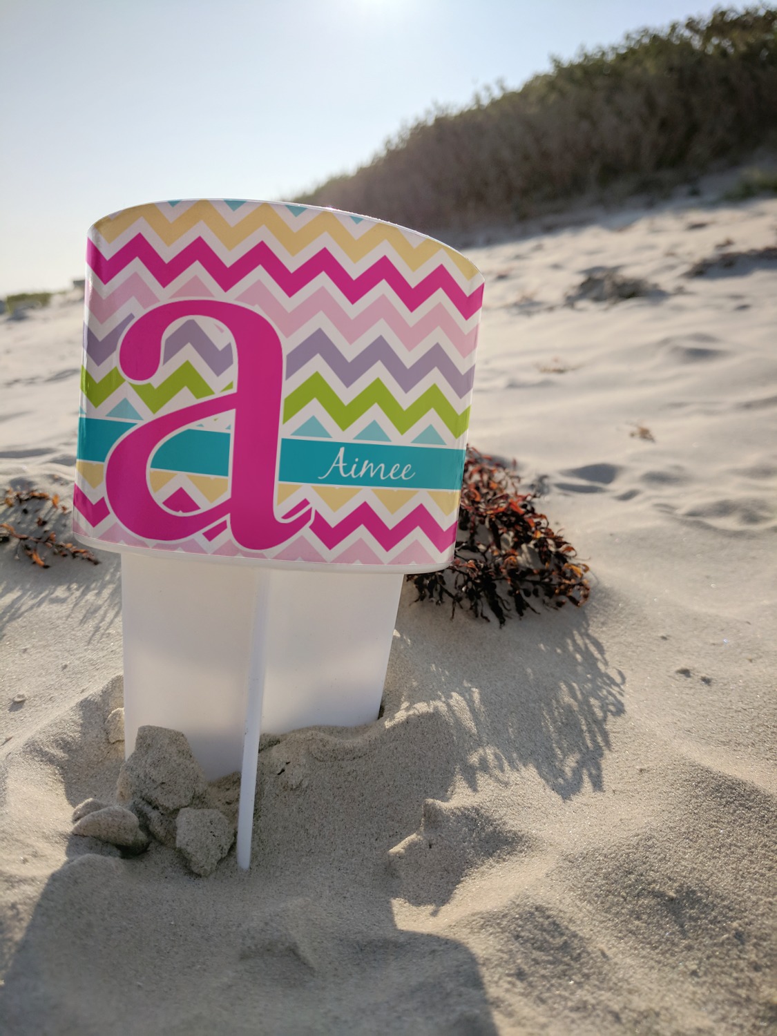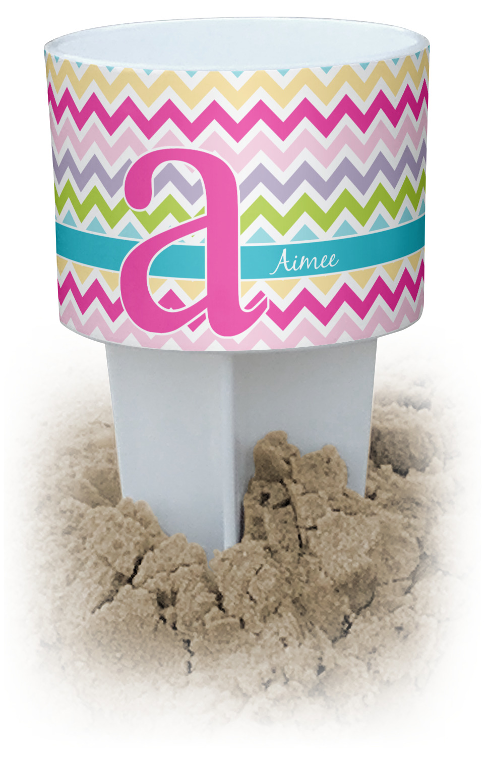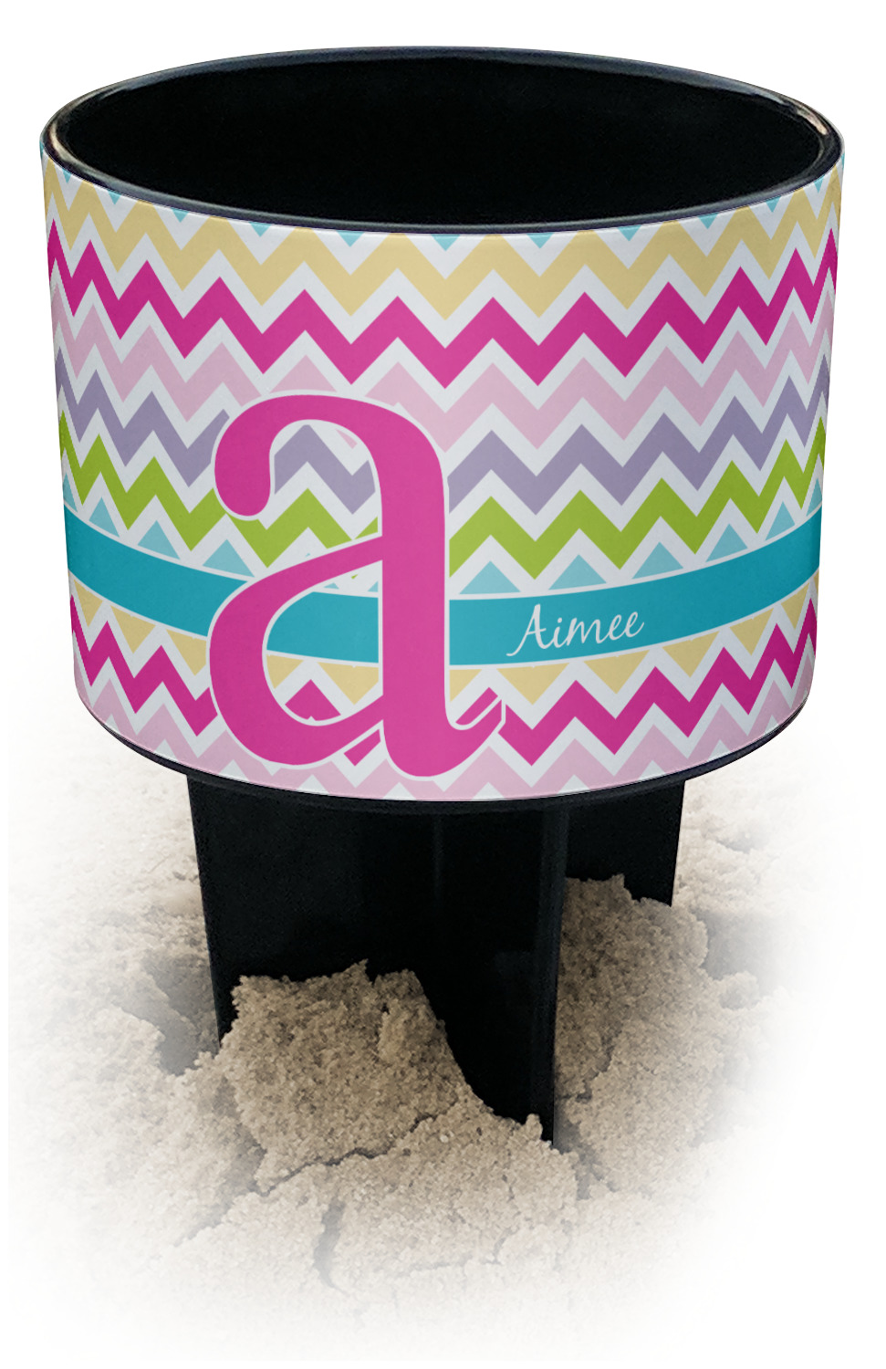 This cup holder has a large stake at its bottom that anchors it to the sand or ground below, while the cup holder rests above the stake. The entire drink holder is made of durable plastic and displays your customization around the cup holder portion. We sell these personalized beach spikers in two different colors: black and white.