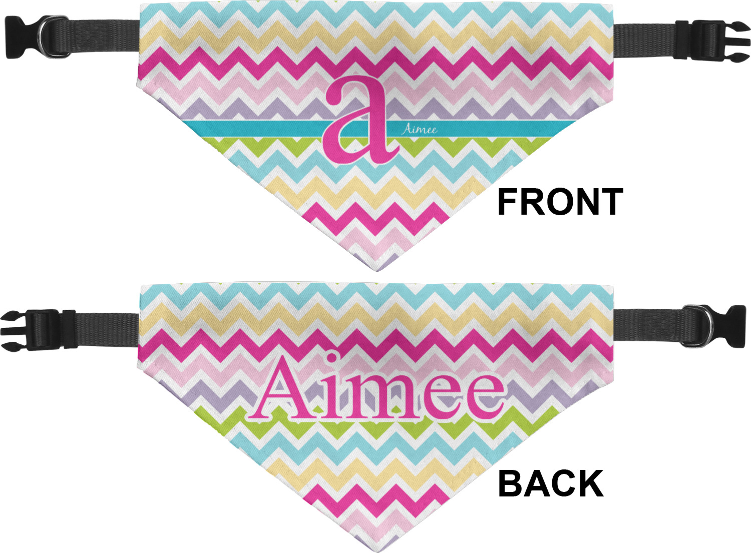We print the front and back of these dog bandanas with your customized design. The bandana itself is made from a durable polyester, sewn together with a gap large enough to accommodate any collar. Regardless, the bandana includes a plain black, canvas collar with plastic snaps, that can easily be removed if desired. These dog bandana collars are available in four sizes: small, medium, large, and extra large. Please see our sizing chart for more information regarding the dimensions of each size.