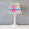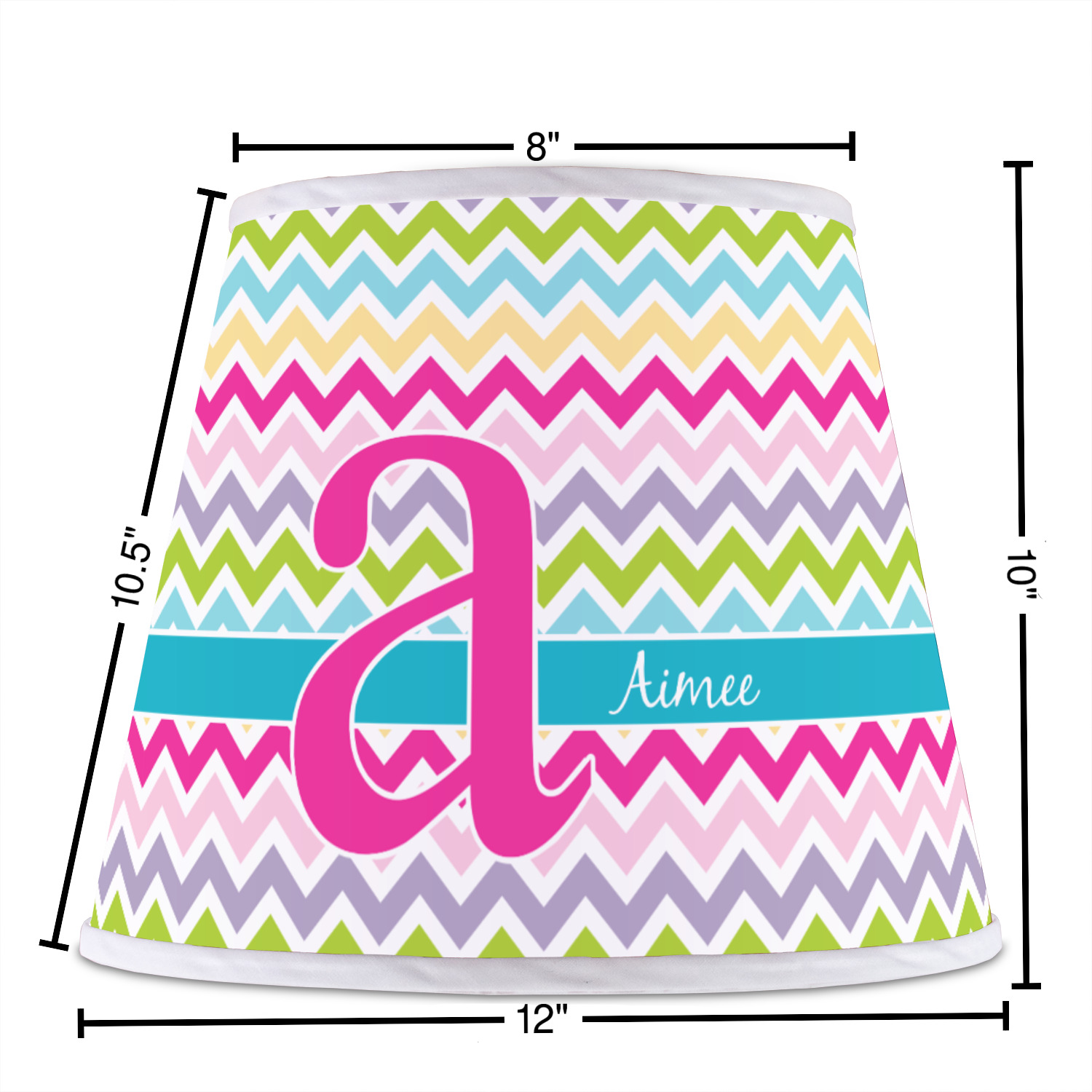 The base of this lampshade is 12 inches in diameter, and the top spans 8 inches in diameter. The total height of the lampshade is 10 inches. The angled nature of this custom lampshade concentrates the light, making it ideal for smaller spaces. This lampshade is made of matte, polyfilm, and displays your customization in its middle. The top and bottom of this colorful lamp shade are lined with a white fabric ribbon (which can be replaced with black inside the design studio) which frames your design and creates a sophisticated finish. As an UNO fitter lampshade, this unique lamp shade will fit a variety of bases.