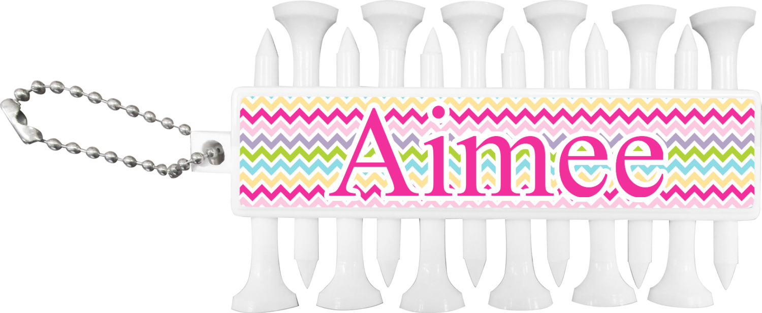 With 12 tees on a lightweight, portable key chain, it almost ensures a great 18 holes. Our tees are made of white plastic and are a little over 2". Design the front and the back of the golf tee holder. Pick from over a hundred designs, colors, and personalization styles! The set even comes with three removable ball markers as well!