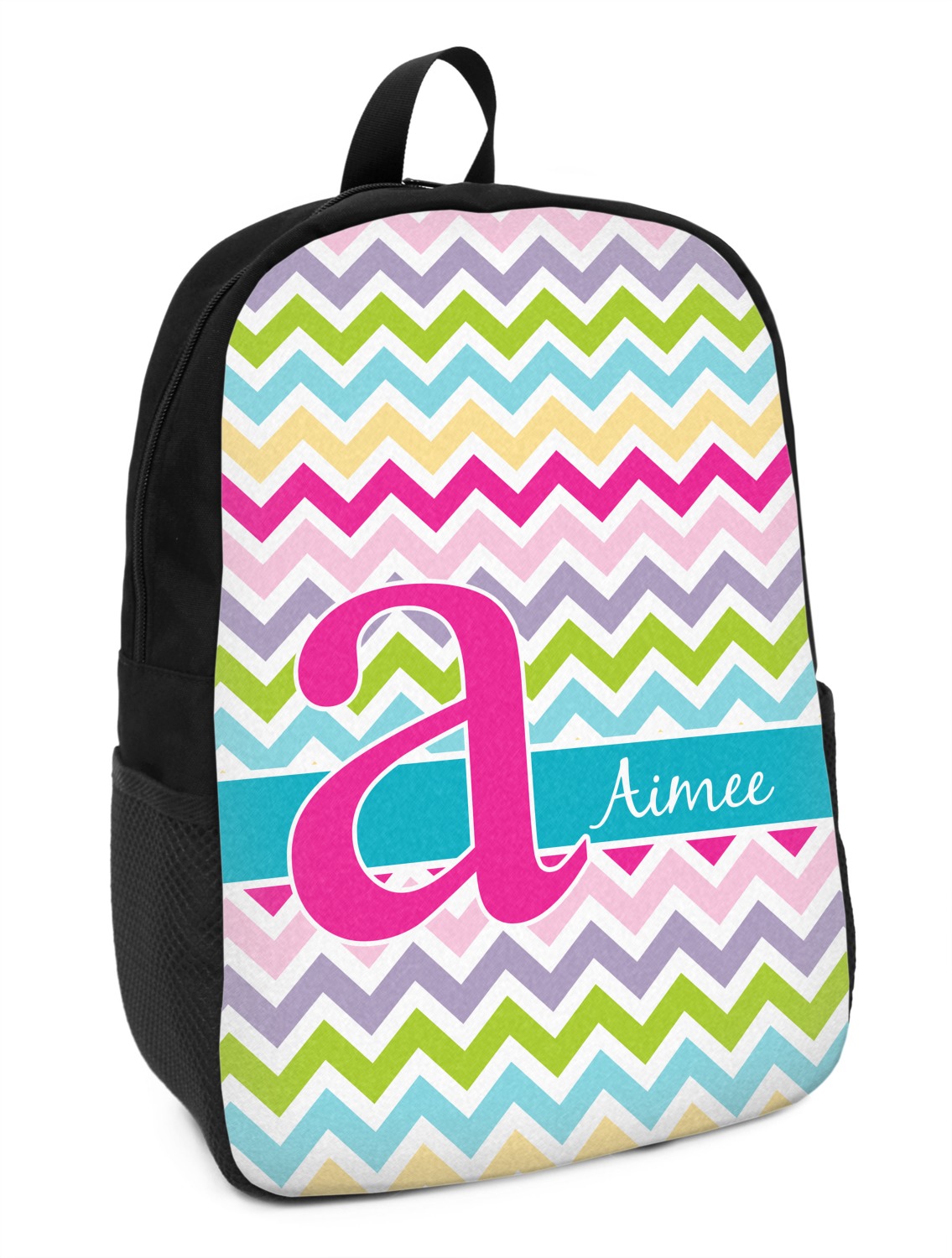 These small backpacks are made of a durable black canvas material with your personalization right on the front. The two shoulder straps are padded and easily adjustable. The bag itself measures at about 11" W x 15" H x 5" D. It's the perfect size for elementary aged kids or adults who want a smaller backpack. On the top of the bag you will find a handle to hang or carry your backpack by as well as a large zipper closure to keep all of your belongings safe inside. On each side of your backpack is a mesh pocket for a small item or water bottle. Inside your backpack you will find a spacious area with a small zipper pocket and a padded laptop slot that will fit up to a 13" laptop (13" being very snug). This is the perfect bag for any student that needs a couple books and their laptop with them at all times. It also works great as a carry on for traveling!