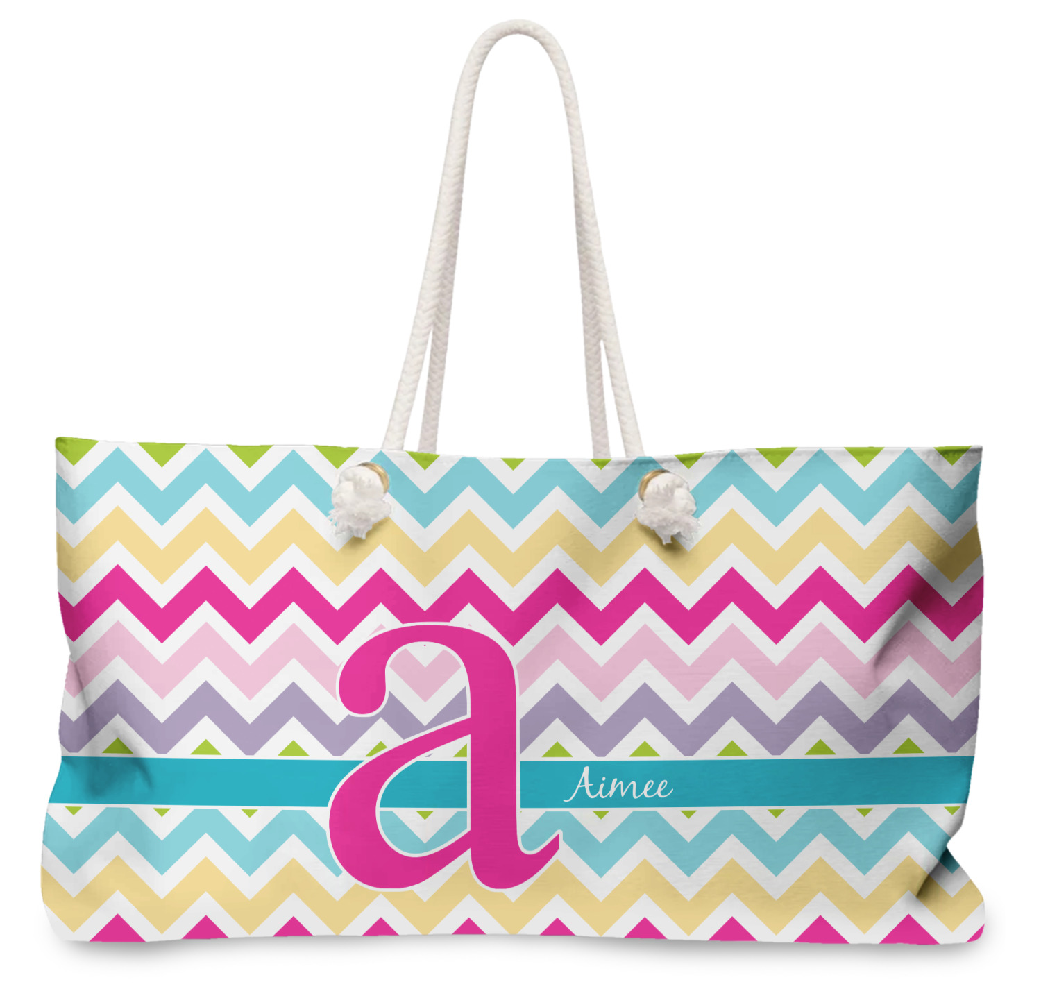 Our oversized weekender tote with rope handles is perfect for your weekend at the beach or on the town. This large tote are 24" W X 13" H, with a 5" gusset and a 27" thick rope handles with a knot that is put through a grommeted brass hole.