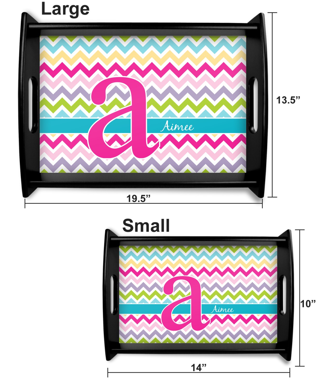 This serving tray with handles features square edges and two rounded sides, creating a very modern look. Each side is fabricated from a beautifully cut, natural wood. The bottom of the interior of the tray displays your customized design in bright, vibrant color. The tray is sold in both a black color and a natural wood look. Each variation of the wood serving tray has two sizes: Small, which is 14" x 10" x 2.25", and Large, which is 19.5" x 13.5" x 2.75".