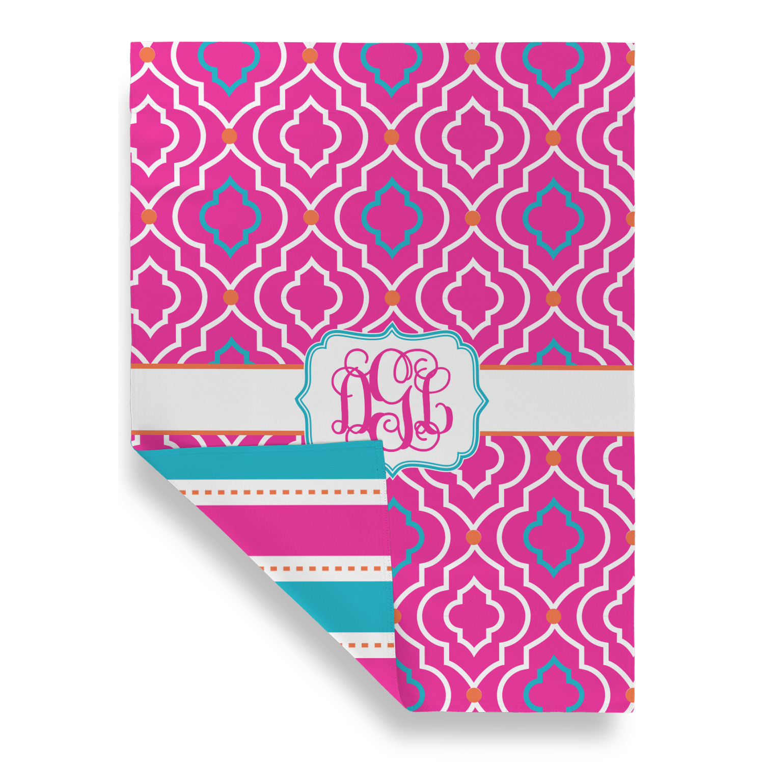 There is nothing old world about this Moroccan trellis design. Bright and vibrant pink, turquoise and orange come together to create one beautiful pattern. A wide white band trimmed in orange pulls the design together.