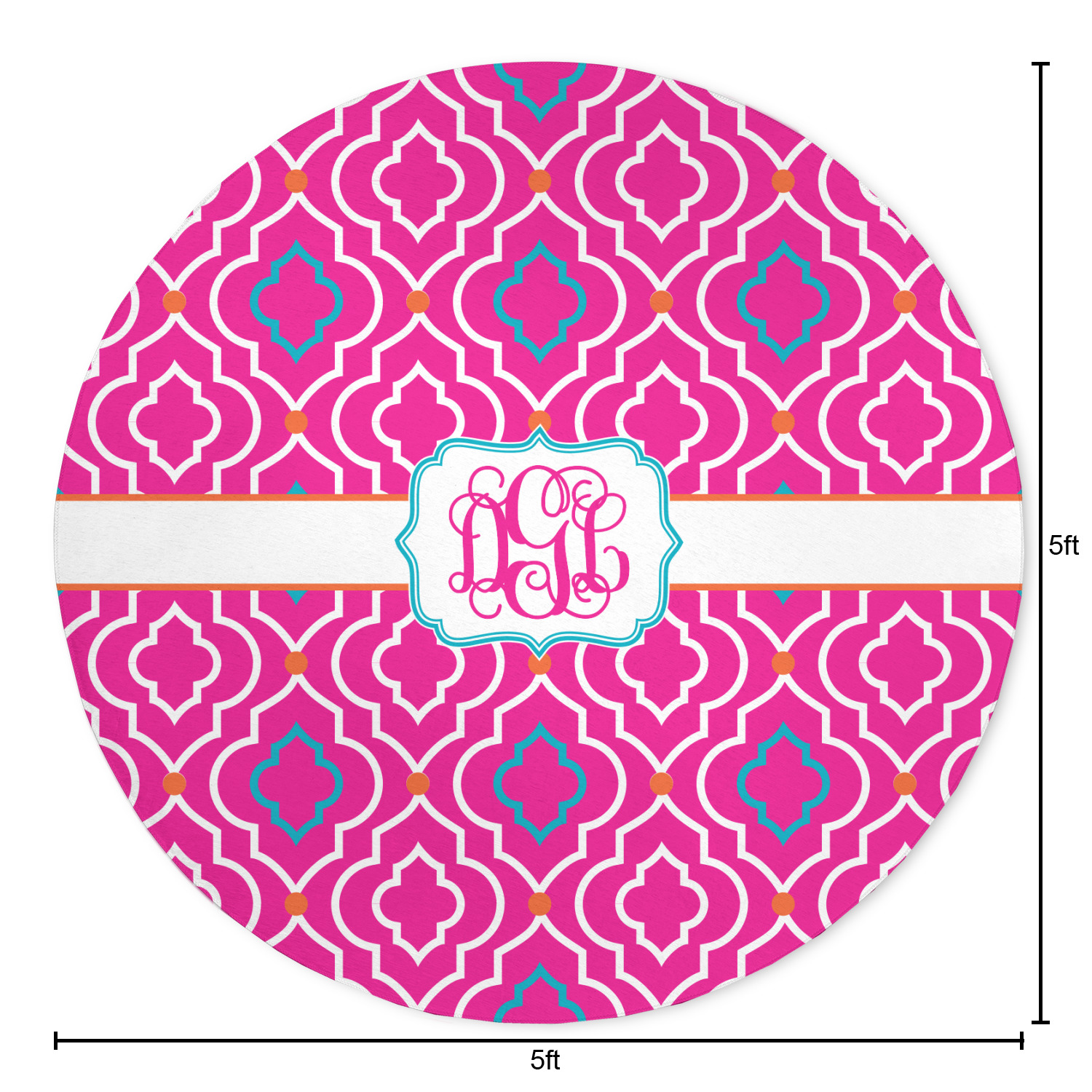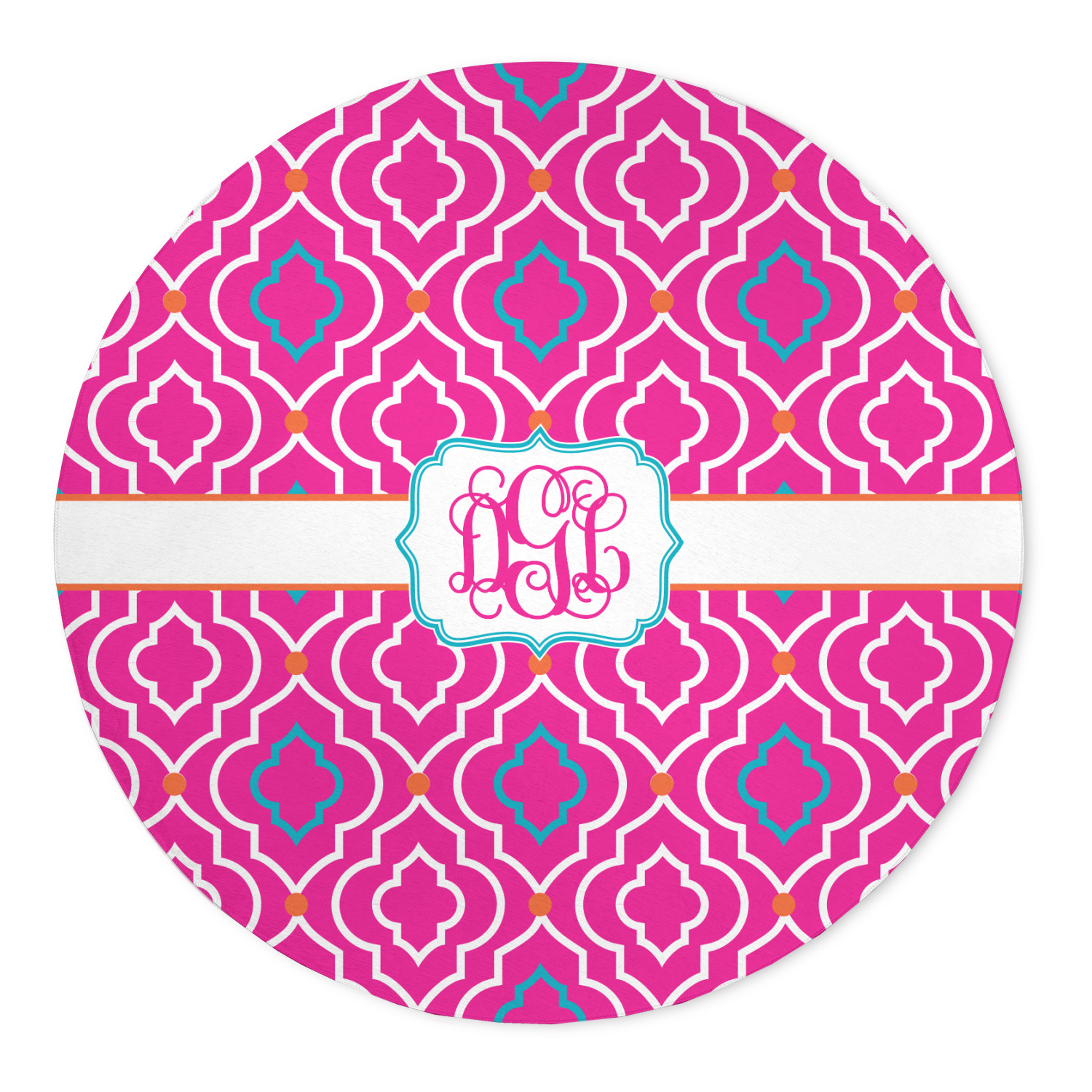 There is nothing old world about this Moroccan trellis design. Bright and vibrant pink, turquoise and orange come together to create one beautiful pattern. A wide white band trimmed in orange pulls the design together.