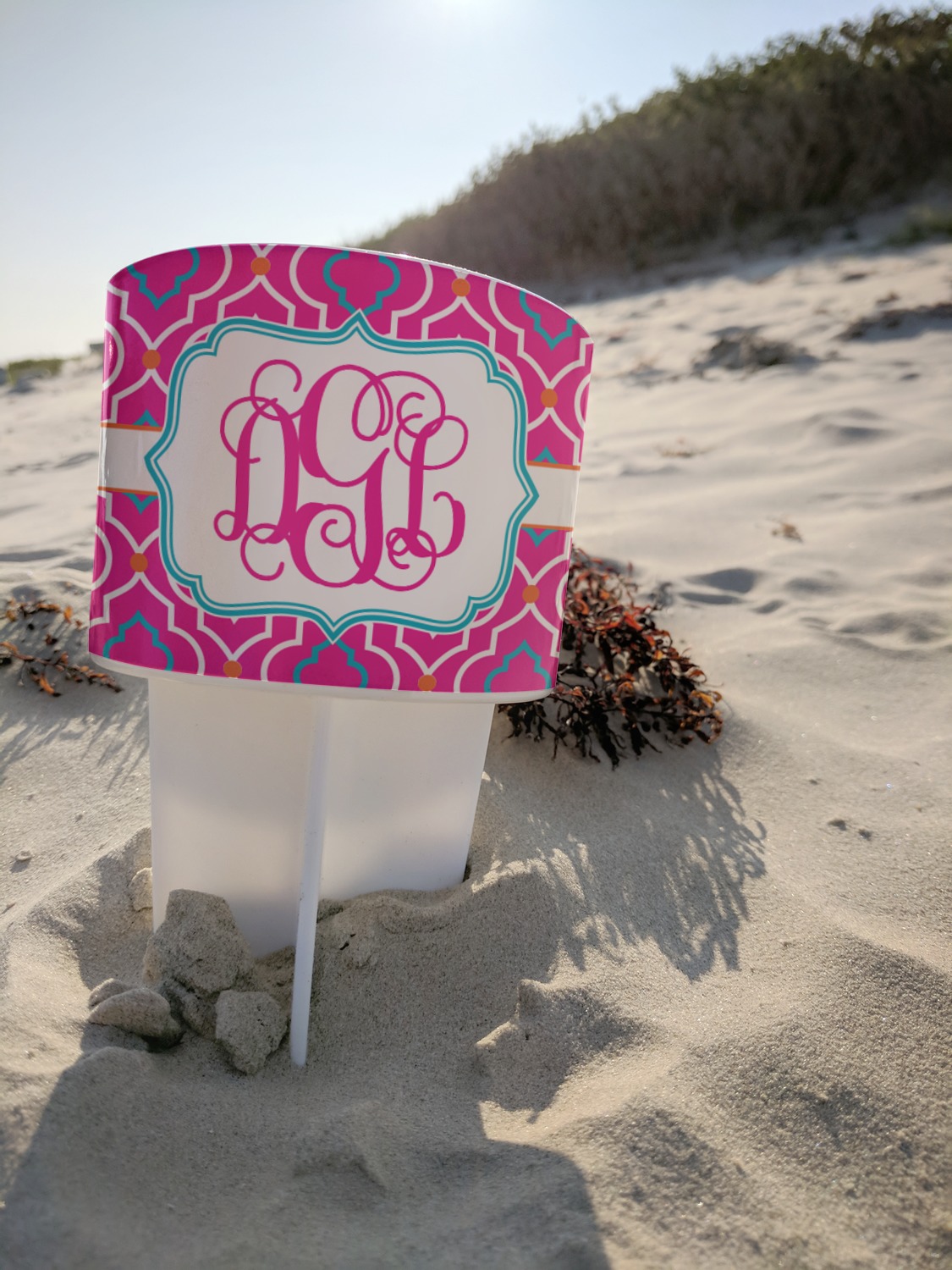 This cup holder has a large stake at its bottom that anchors it to the sand or ground below, while the cup holder rests above the stake. The entire drink holder is made of durable plastic and displays your customization around the cup holder portion. We sell these personalized beach spikers in two different colors: black and white.