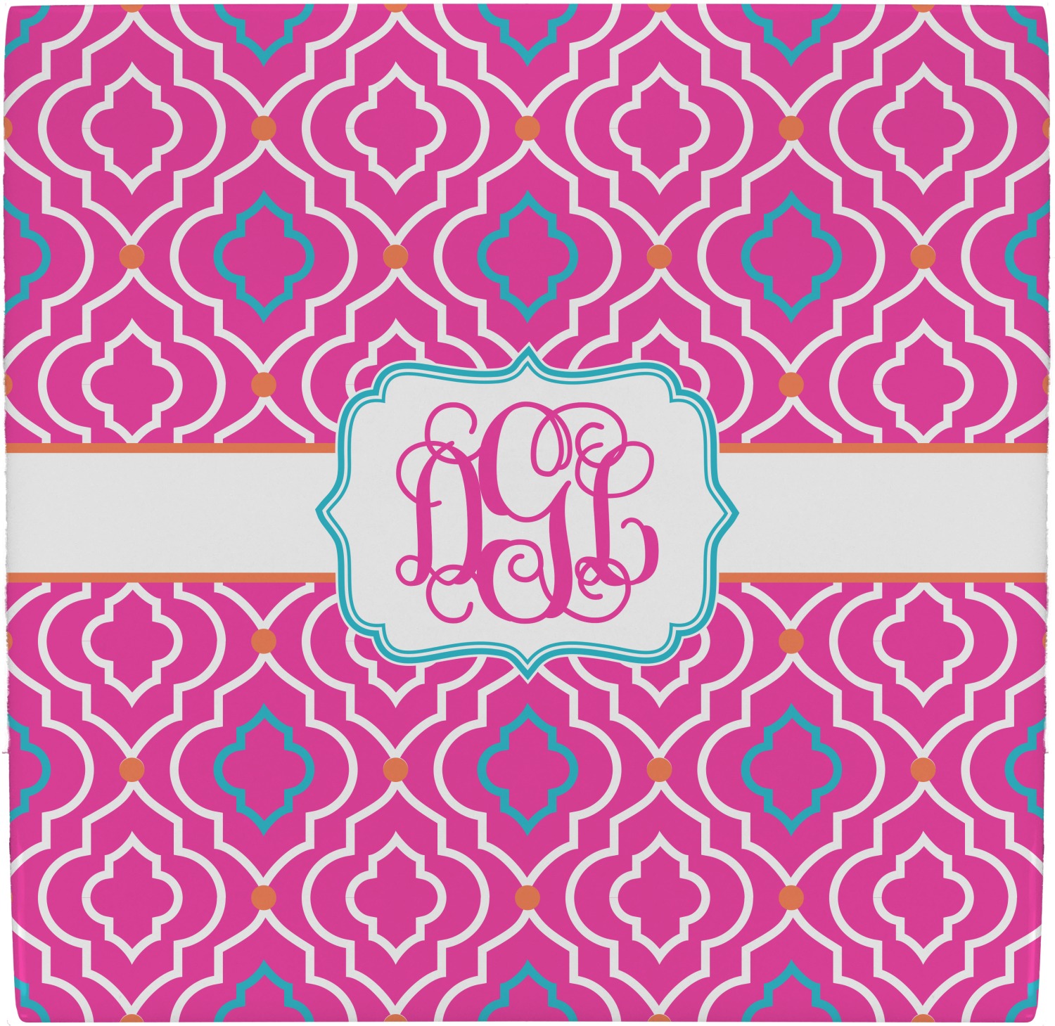 There is nothing old world about this Moroccan trellis design. Bright and vibrant pink, turquoise and orange come together to create one beautiful pattern. A wide white band trimmed in orange pulls the design together.