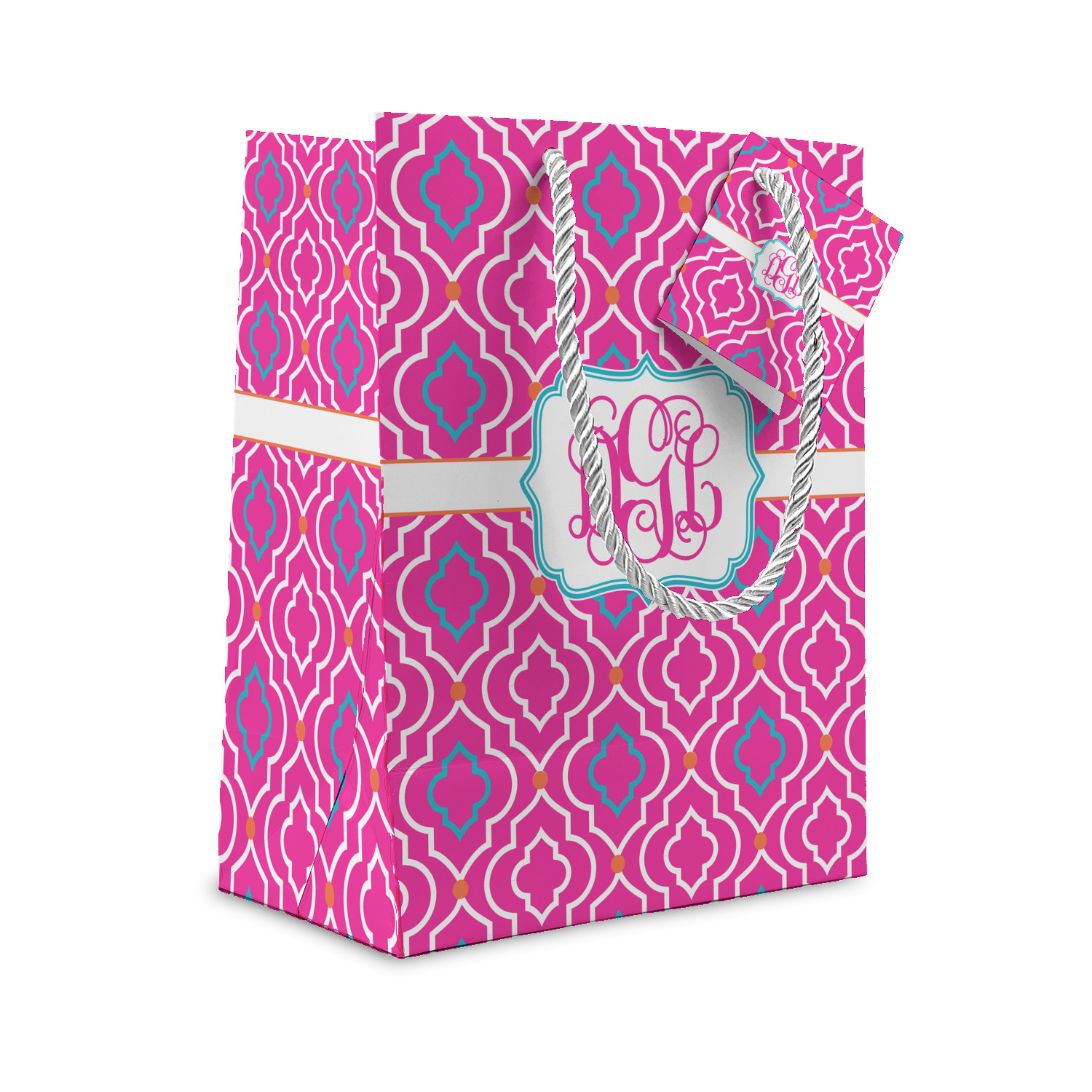 A fancy white label outlined in pink and turquoise is used to showcase the personalization of your choice.