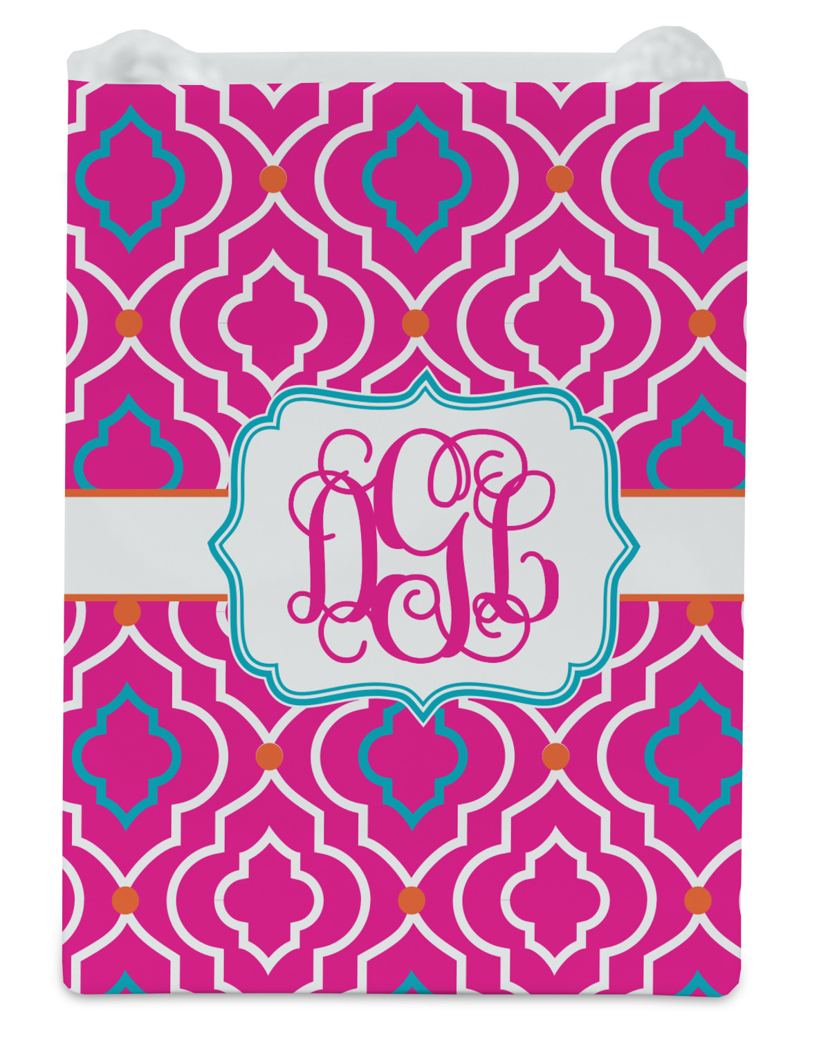 There is nothing old world about this Moroccan trellis design. Bright and vibrant pink, turquoise and orange come together to create one beautiful pattern. A wide white band trimmed in orange pulls the design together.