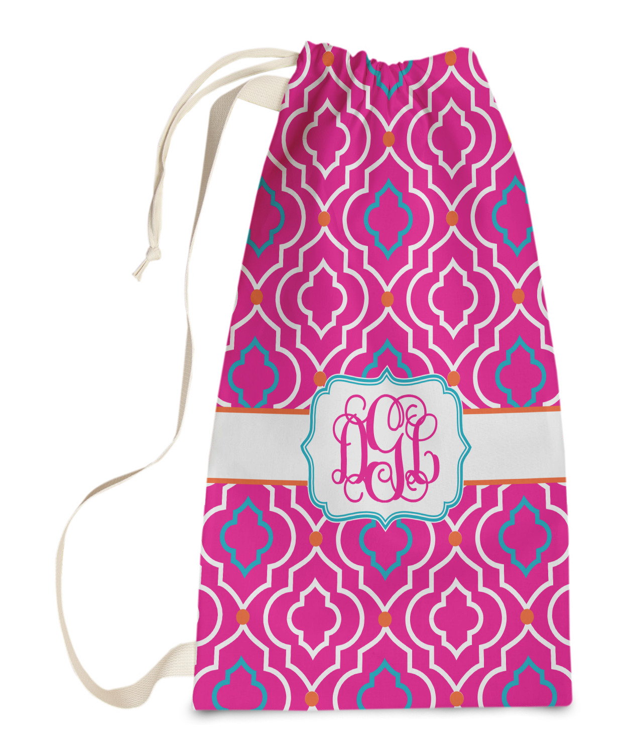 Carry your laundry in style with these customized laundry bags. Available in two sizes, featuring a natural colored woven strap and a cinch cord, these bags hold a lot of clothes or anything else you want to fit in them.