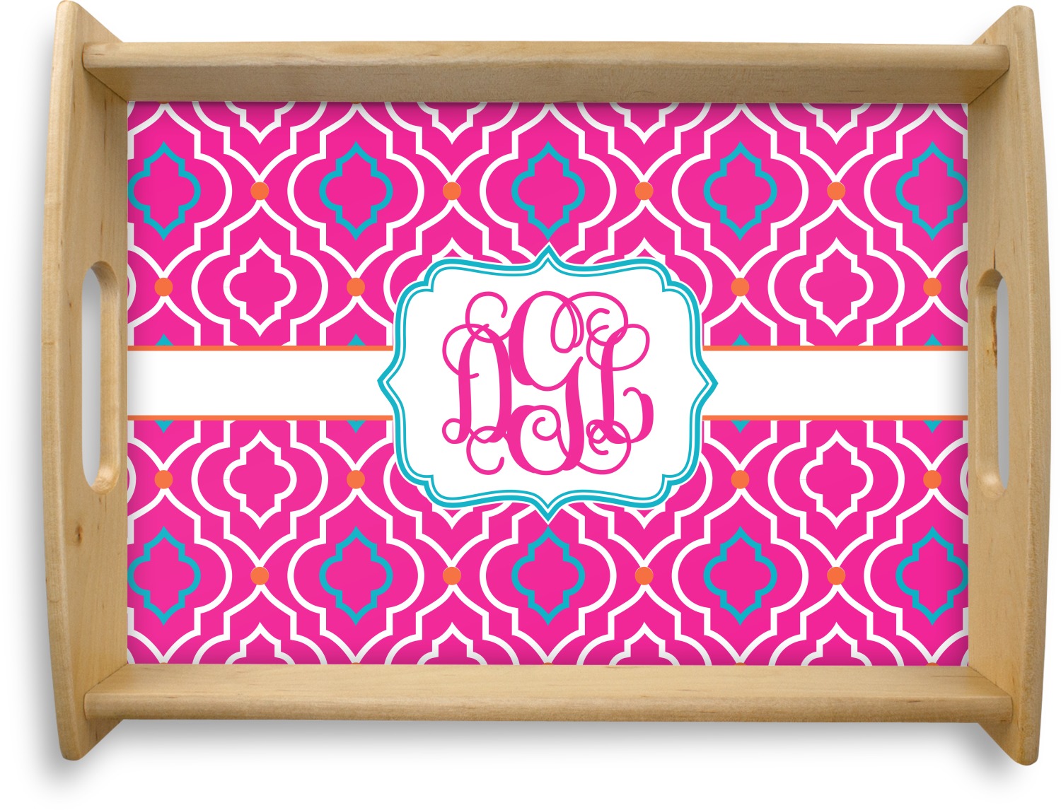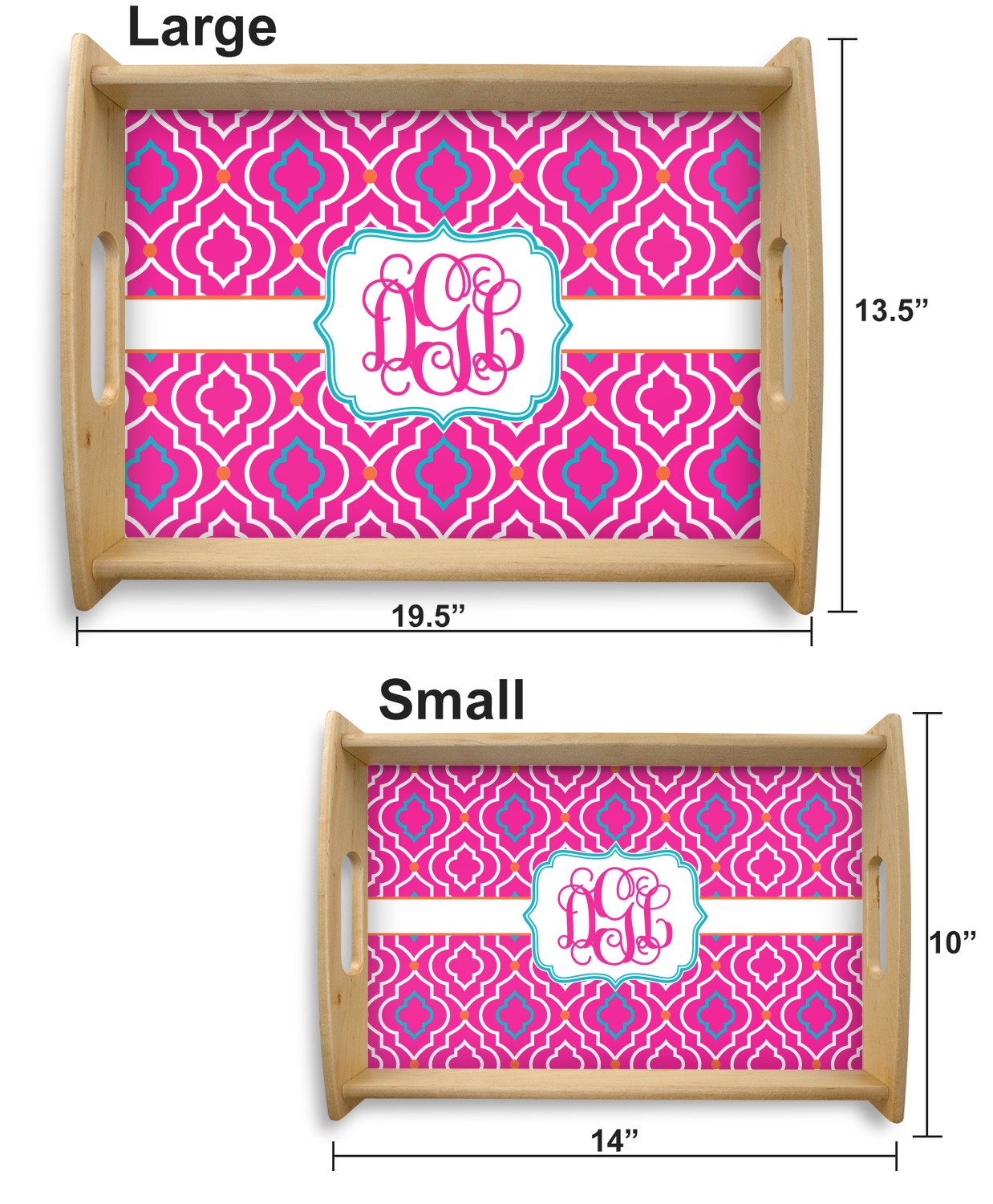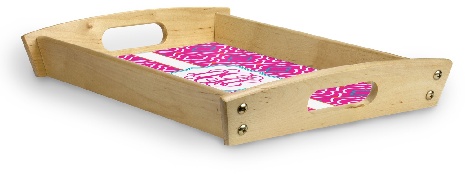 This serving tray with handles features square edges and two rounded sides, creating a very modern look. Each side is fabricated from a beautifully cut, natural wood. The bottom of the interior of the tray displays your customized design in bright, vibrant color. The tray is sold in both a black color and a natural wood look. Each variation of the wood serving tray has two sizes: Small, which is 14" x 10" x 2.25", and Large, which is 19.5" x 13.5" x 2.75".
