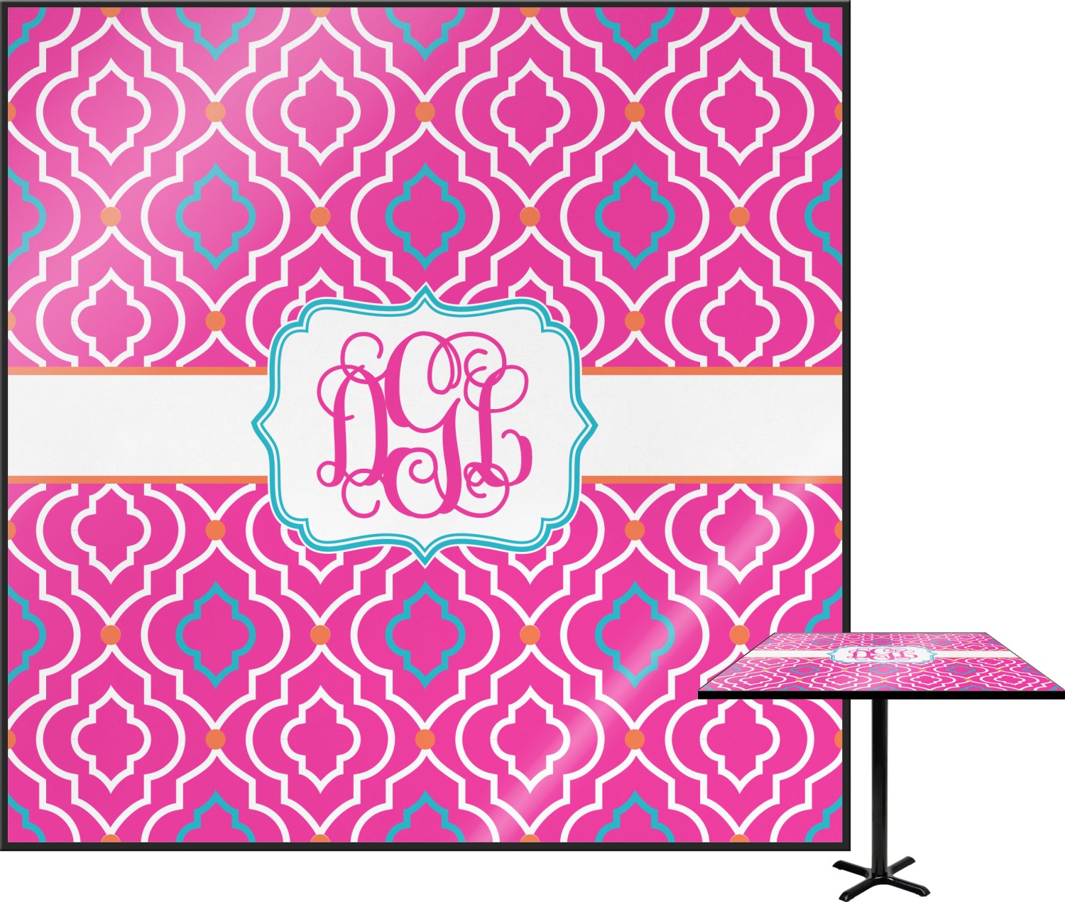 There is nothing old world about this Moroccan trellis design. Bright and vibrant pink, turquoise and orange come together to create one beautiful pattern. A wide white band trimmed in orange pulls the design together.