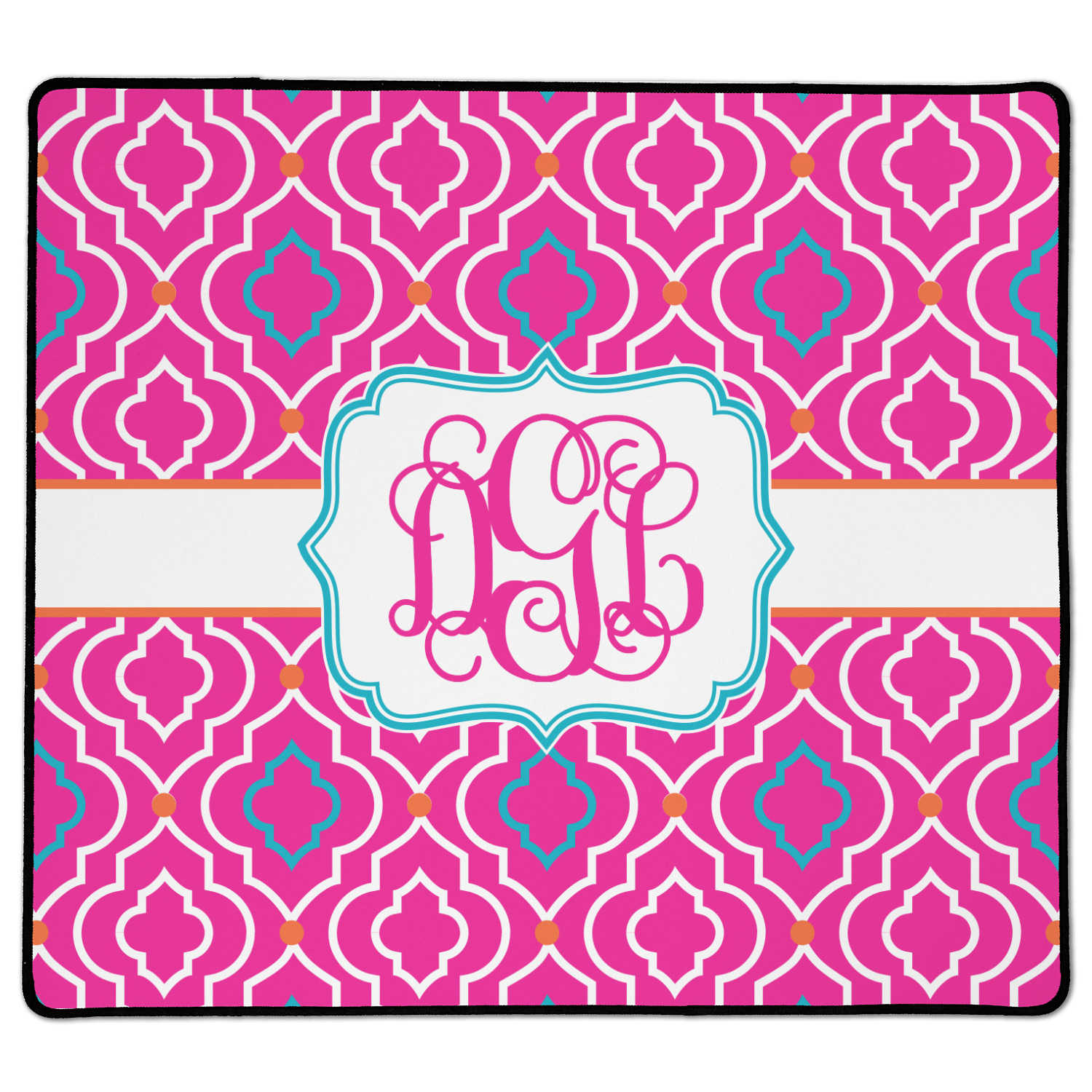 There is nothing old world about this Moroccan trellis design. Bright and vibrant pink, turquoise and orange come together to create one beautiful pattern. A wide white band trimmed in orange pulls the design together.