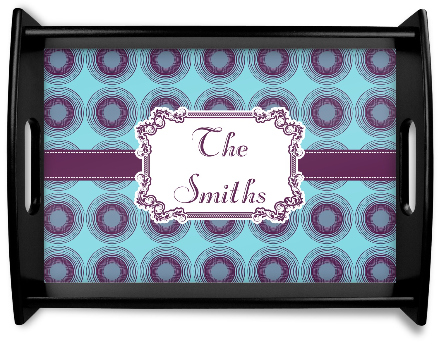 This serving tray with handles features square edges and two rounded sides, creating a very modern look. Each side is fabricated from a beautifully cut, natural wood. The bottom of the interior of the tray displays your customized design in bright, vibrant color. The tray is sold in both a black color and a natural wood look. Each variation of the wood serving tray has two sizes: Small, which is 14" x 10" x 2.25", and Large, which is 19.5" x 13.5" x 2.75".