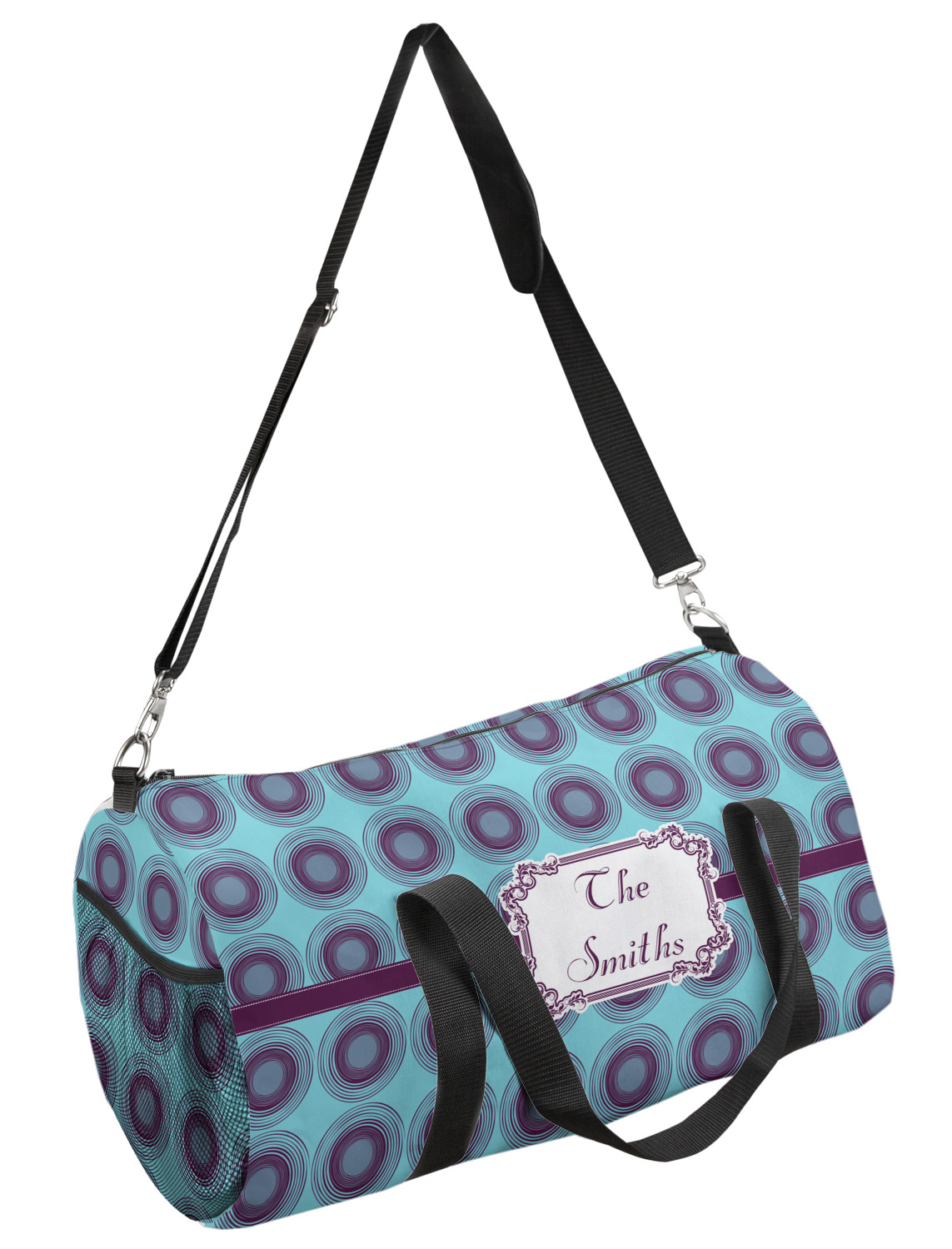 This duffle is a sturdy bag made of a canvas material. It comes in two sizes: Small (19"W x 9.5"H x 9.5"D) and Large (23"W x 12"H x 12"D). The bag is a cylindrical shape with a black adjustable strap and two handles. On one side is an elastic pouch to put a waterbottle or other small item. Your product will be sublimated with your design and is able to be designed on the front, back, and sides. Be sure to remember that the straps may cut into parts of your design if you upload your own artwork.
