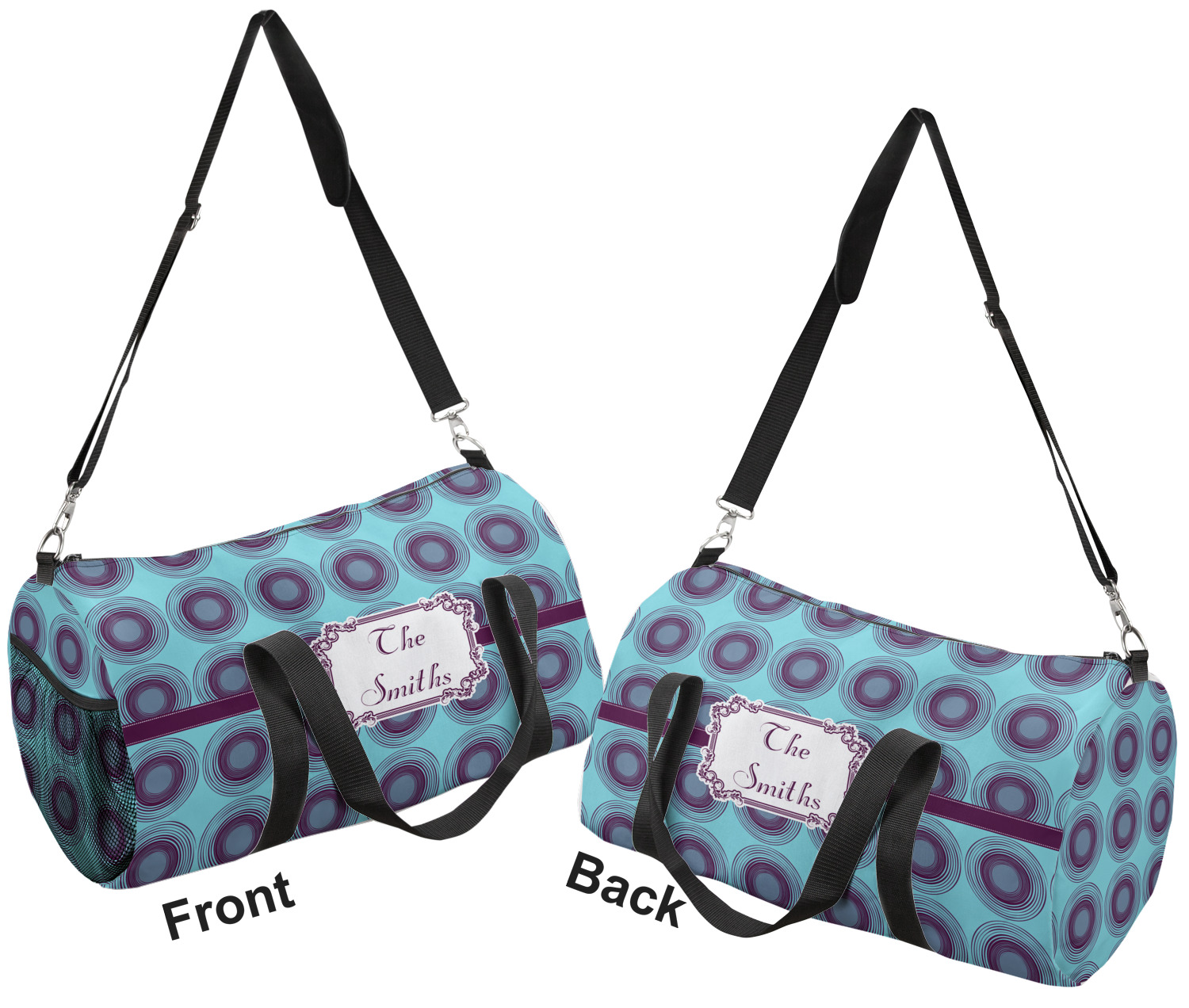This duffle is a sturdy bag made of a canvas material. It comes in two sizes: Small (19"W x 9.5"H x 9.5"D) and Large (23"W x 12"H x 12"D). The bag is a cylindrical shape with a black adjustable strap and two handles. On one side is an elastic pouch to put a waterbottle or other small item. Your product will be sublimated with your design and is able to be designed on the front, back, and sides. Be sure to remember that the straps may cut into parts of your design if you upload your own artwork.