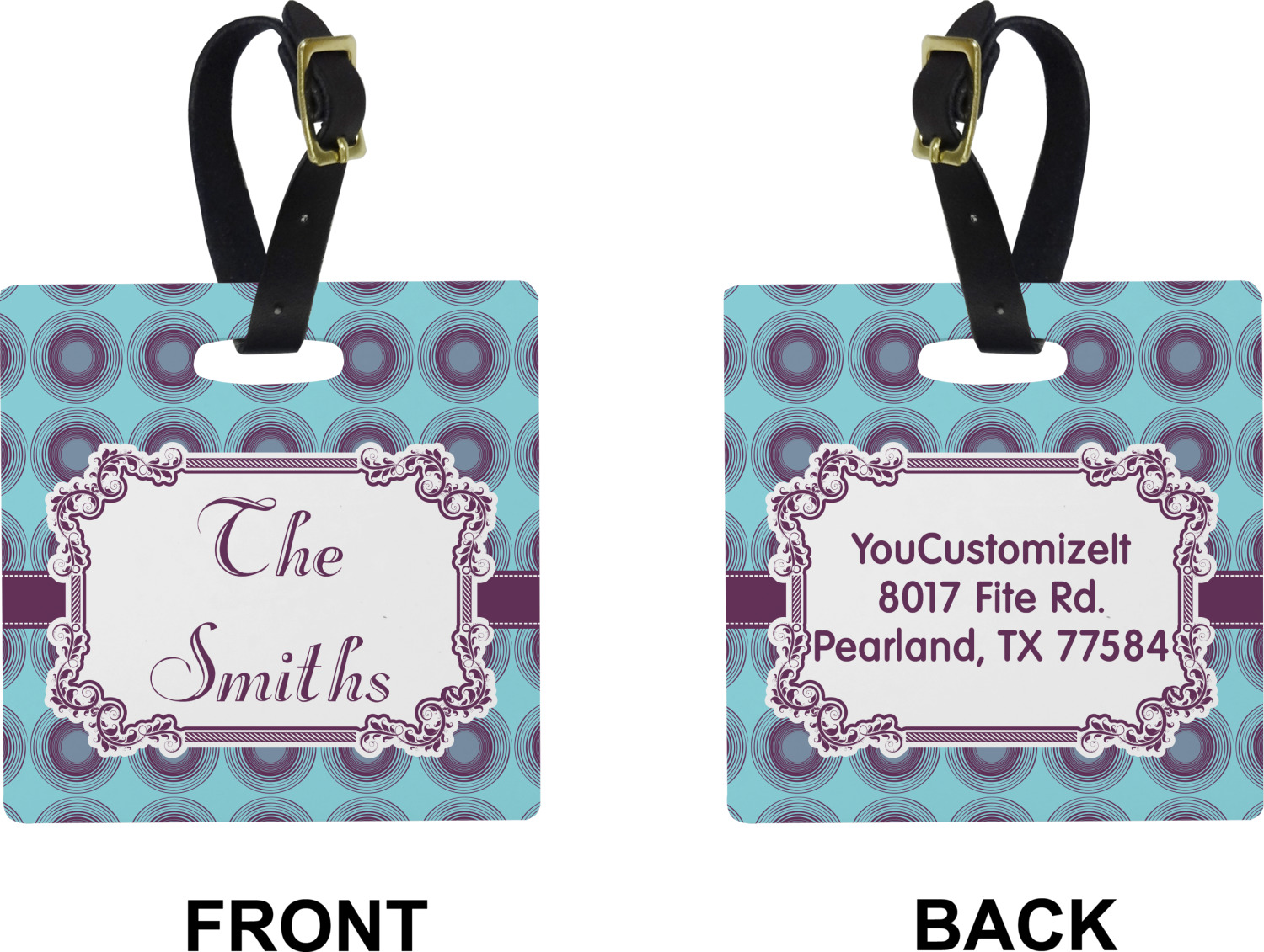 These personalized bag tags are sold in a variety of shapes, so that you may find the product that meets your vision exactly. We sell a round luggage tag, which measures at approximately 4" x 4". Our square luggage tag is about 3.5" x 3.5", while our rectangular version is 2.75" x 4 ".