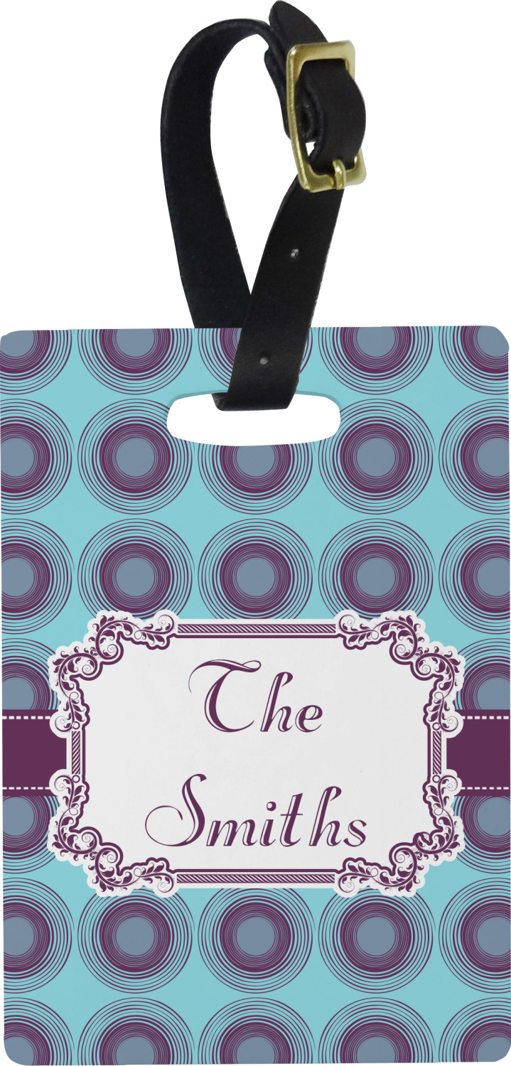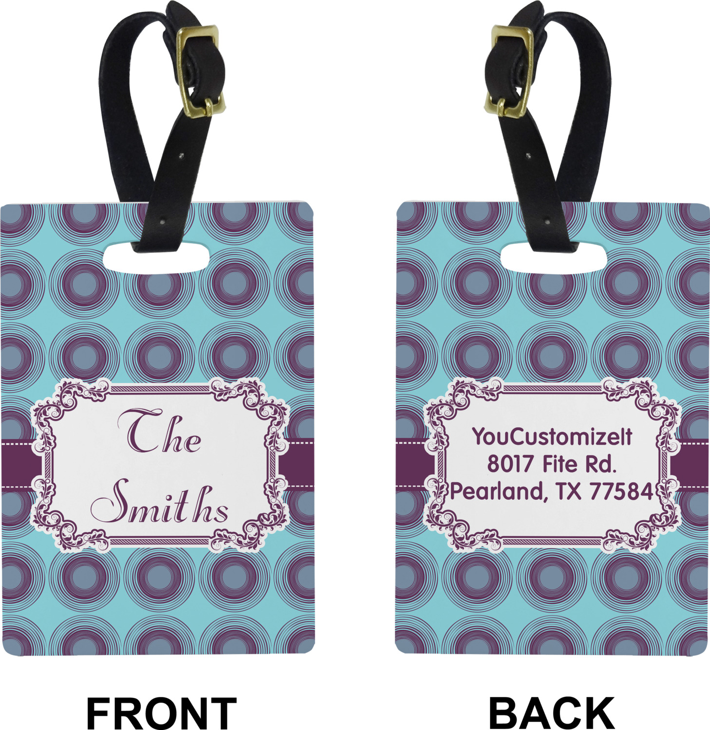 These personalized bag tags are sold in a variety of shapes, so that you may find the product that meets your vision exactly. We sell a round luggage tag, which measures at approximately 4" x 4". Our square luggage tag is about 3.5" x 3.5", while our rectangular version is 2.75" x 4 ".