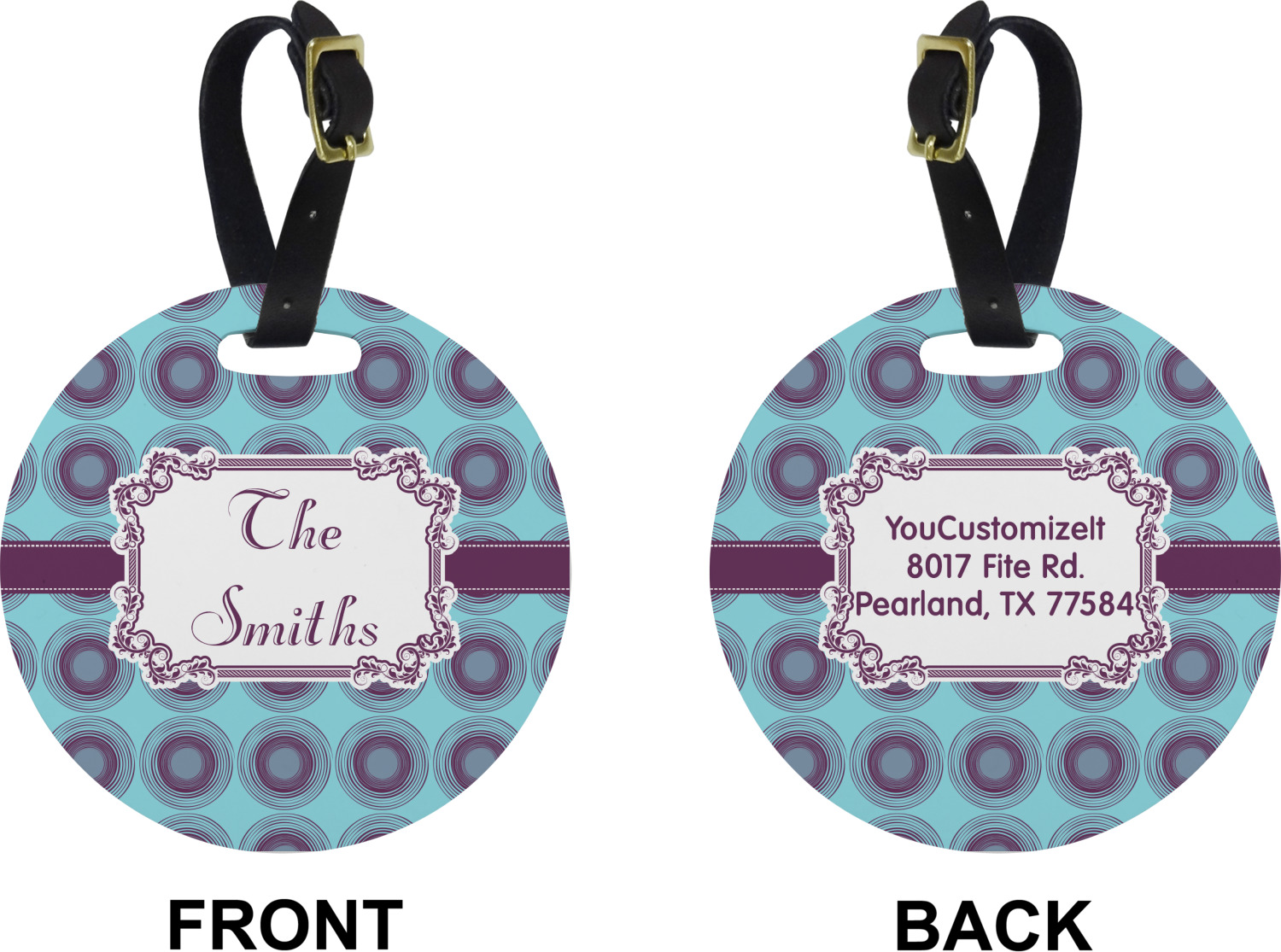 These personalized bag tags are sold in a variety of shapes, so that you may find the product that meets your vision exactly. We sell a round luggage tag, which measures at approximately 4" x 4". Our square luggage tag is about 3.5" x 3.5", while our rectangular version is 2.75" x 4 ".