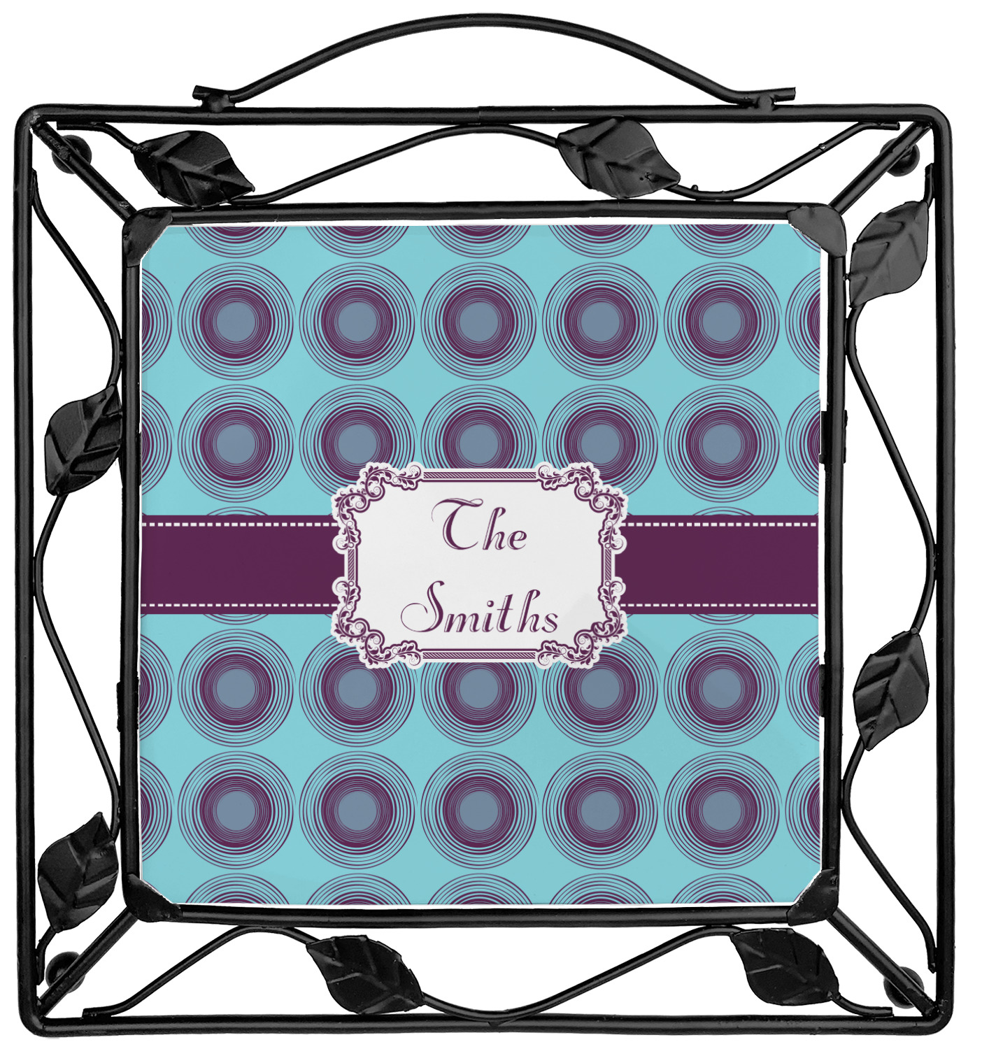 Our square trivets are made from a durable, wrought iron. This model features 4 small half circles, one on each corner, and a larger ring of iron that circles the central, customized tile. Each of the 4 corners has a round foot on its bottom for stability. This trivet is 8.75 by 8.75 inches, but the central tile measures at 6 inches on both sides.