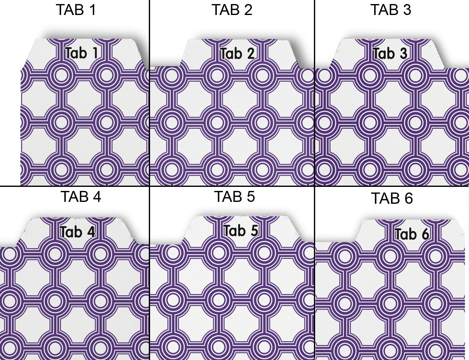 Whether you use binders at school or at work, we have designs to suit all of them. Available in 5 or 6 tab sets, you are sure to find a set to suit your needs. The back of each one is white and can be used to take notes, write vital information on, etc.