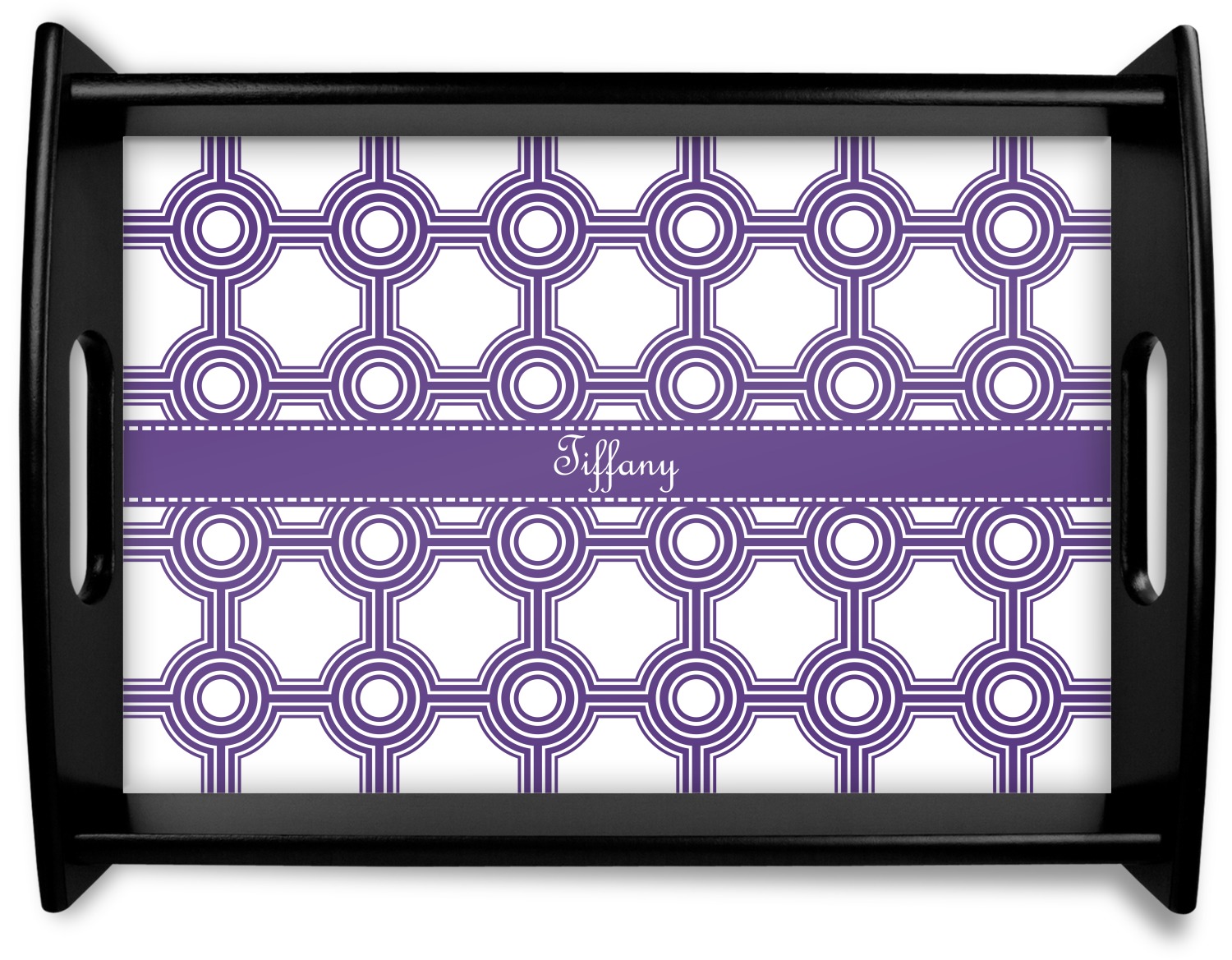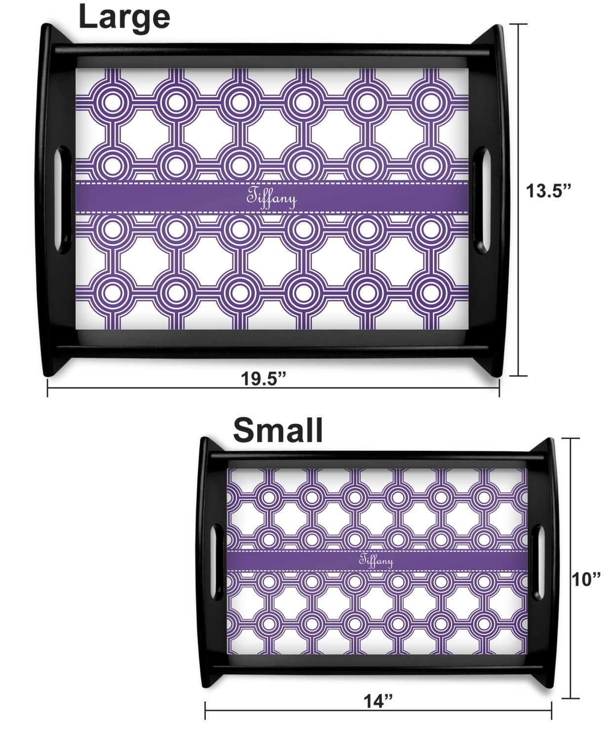 This serving tray with handles features square edges and two rounded sides, creating a very modern look. Each side is fabricated from a beautifully cut, natural wood. The bottom of the interior of the tray displays your customized design in bright, vibrant color. The tray is sold in both a black color and a natural wood look. Each variation of the wood serving tray has two sizes: Small, which is 14" x 10" x 2.25", and Large, which is 19.5" x 13.5" x 2.75".